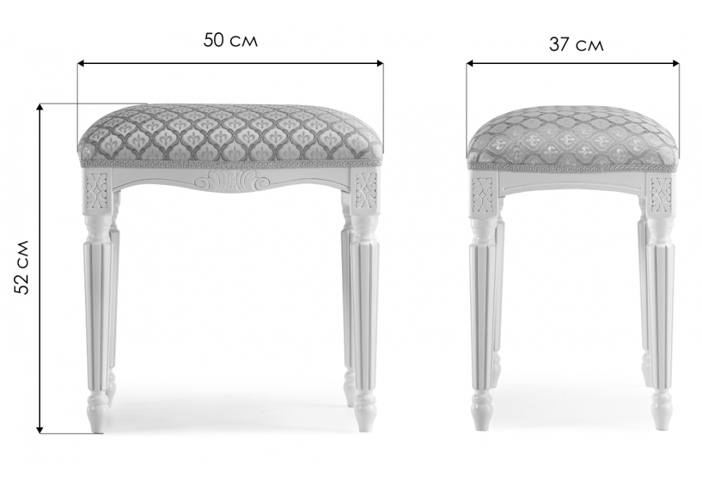 Материал каркаса - массив бука; Материал сиденья - ткань; Материал обивки - ткань; Цвет ножек - белый; Ширина - 49; Глубина - 37; Высота - 52;