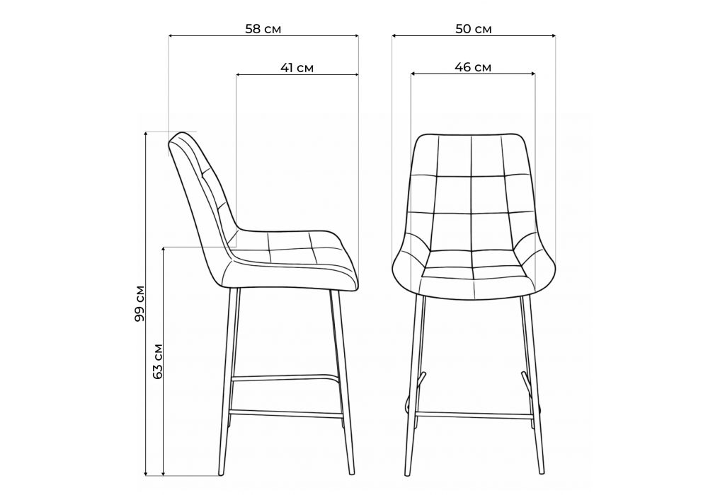 Материал каркаса - металл; Материал сиденья - велюр; Материал обивки - велюр; Ширина - 50; Глубина - 58; Высота - 99; Ширина сиденья - 46; Глубина сиденья - 41; Высота сиденья - 63;