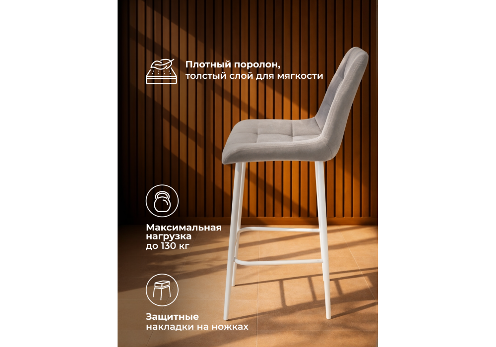 Материал каркаса - металл; Материал сиденья - велюр; Материал обивки - велюр; Цвет ножек - белый; Ширина - 50; Глубина - 58; Высота - 99; Ширина сиденья - 46; Глубина сиденья - 41; Высота сиденья - 63;