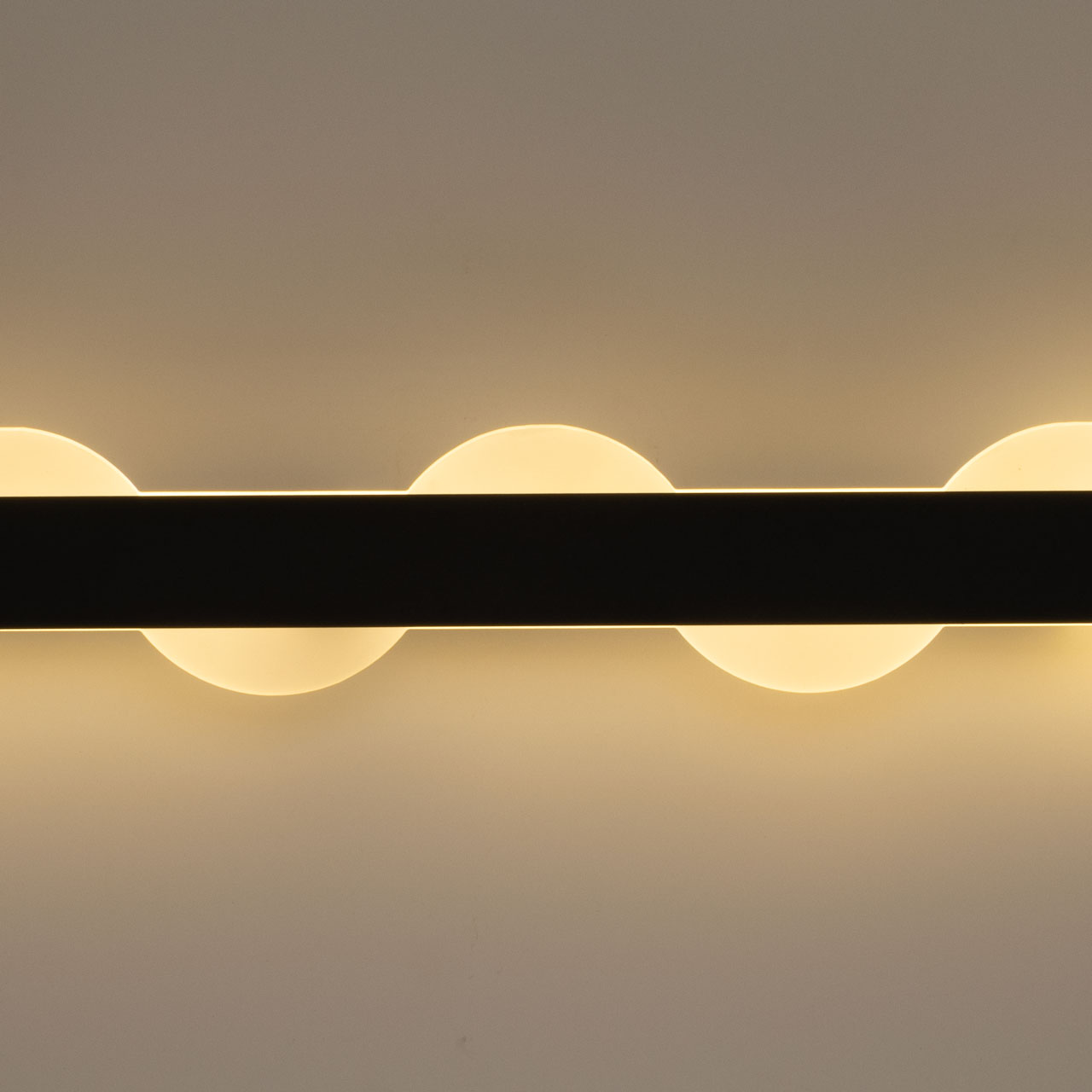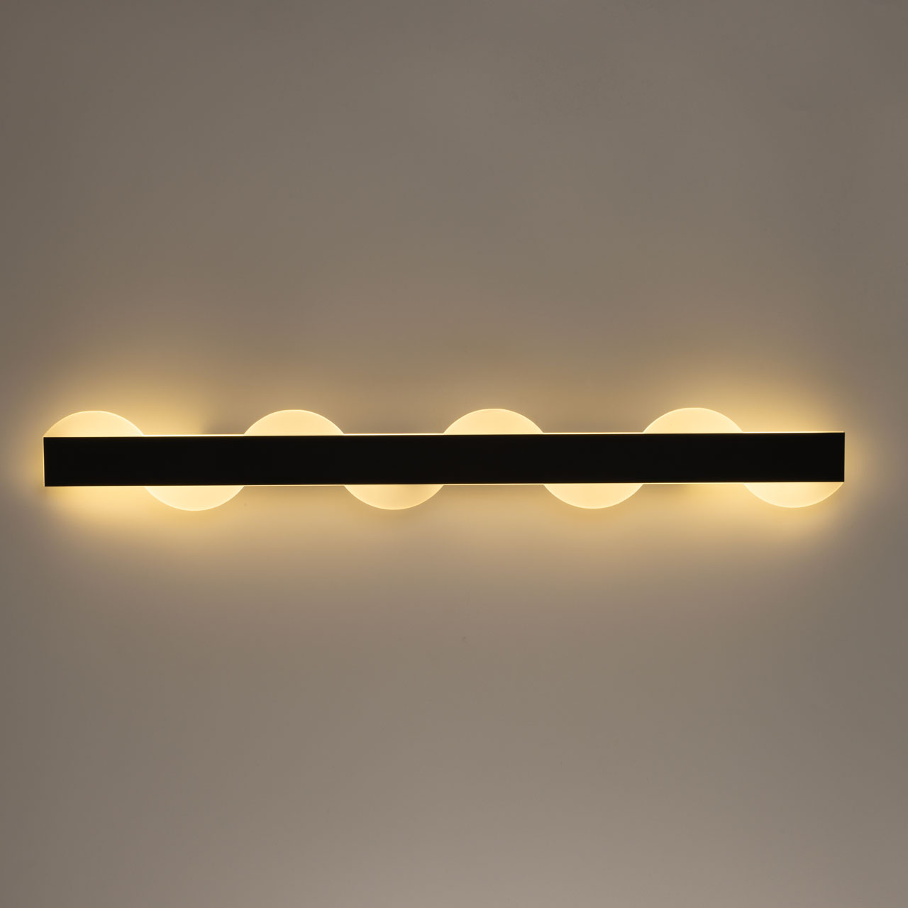 Металлическое основание потолочного светильника окрашено в черный цвет. Светодиодные источники света закрыты матовым акрилом. Светильник декорирован элементами из матового акрила.