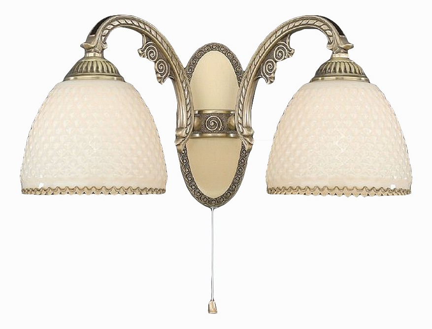 Бра Reccagni Angelo A 7005/2 Итальянского производсва – уникальное сочетание высокого качества и удивительных фактур. Этот светильник Классического стиля хорошо подойдет Для гостиной и придаст помещению мягкий и приятный свет. Плафоны белые из стекла. Арматура бронза из металла. Кол-во ламп - 2шт. Общая мощность 120W