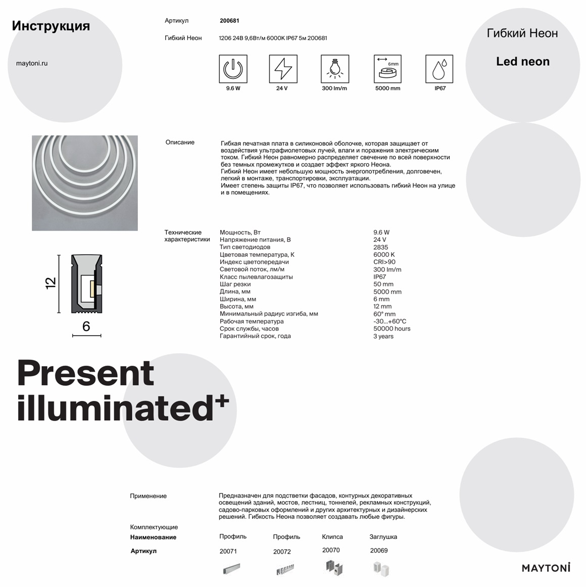 Гибкий неон 6000K IP67 Maytoni Led Strip 200681 - это универсальная модель светодиодной подсветки с вертикальным изгибом, которая имеет размеры 6 мм х 12 мм х 5000 мм и позволяет создавать динамичные световые решения, огибая контуры в вертикальной плоскости. Конструкция устройства представляет собой гибкую печатную плату в белой силиконовой оболочке, которая защищает от воздействия ультрафиолетовых лучей, влаги и поражения электрическим током. Минимальный радиус изгиба равен 60° мм, а шаг резки 50 мм. Благодаря источнику света с типом цоколя LED, мощности 9,6 Вт и цветовой температуре 6000 К, этот осветительный прибор обеспечивает комфортное и равномерное освещение на площади до 5 квадратных метров, создавая уютную атмосферу в вашем придомовом пространстве. Световой поток равен 300 Лм. Гибкий Неон равномерно распределяет свечение по всей поверхности без темных промежутков и создает эффект яркого Неона. При этом артикул Led Strip 200681 имеет небольшую мощность энергопотребления, долговечен, легкий в монтаже, транспортировке и эксплуатации. Данная модель имеет высокую степень защиты IP67, что позволяет использовать ее для подсветки фасадов, контурных декоративных освещений зданий, мостов, лестниц, тоннелей, рекламных конструкций, садово-парковых оформлений и других архитектурных и дизайнерских решений. Гибкость Неона позволяет создавать любые фигуры. При подключении гибкого Неона к сети переменного тока напряжения AC 230В используйте источник напряжения DC 24В (в комплектацию не входит). Данную модель светодиодной подсветки вы всегда можете купить в интернет-магазине 220svet.