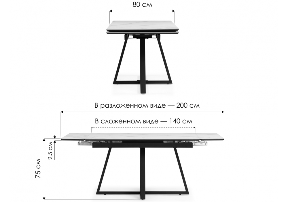 Материал каркаса - металл; Материал столешницы - Керамика; Ширина - 90; Высота - 75; Длина - 140;