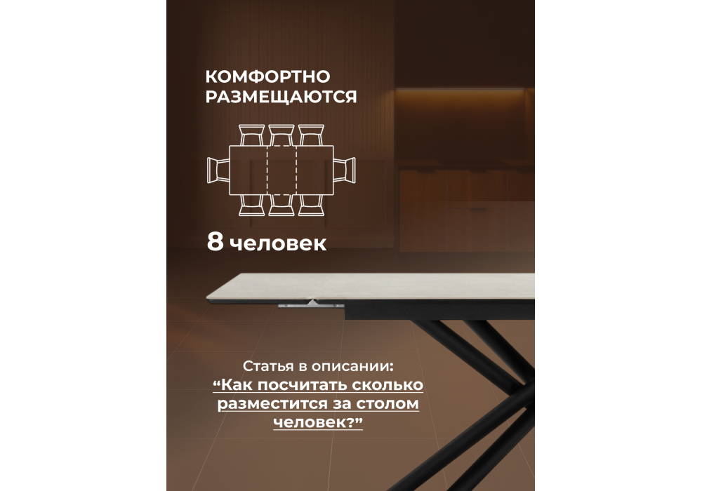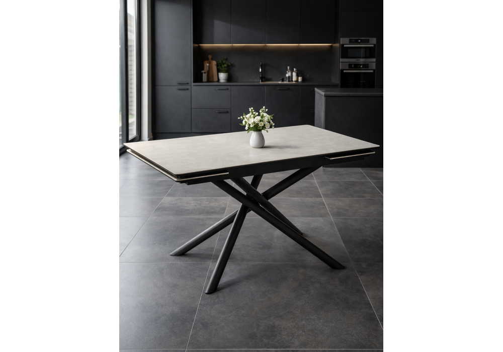 Материал каркаса - металл; Материал столешницы - Керамика; Цвет ножек - черный; Ширина - 80; Высота - 75; Длина стола в разложенном виде - 180; Длина - 120;
