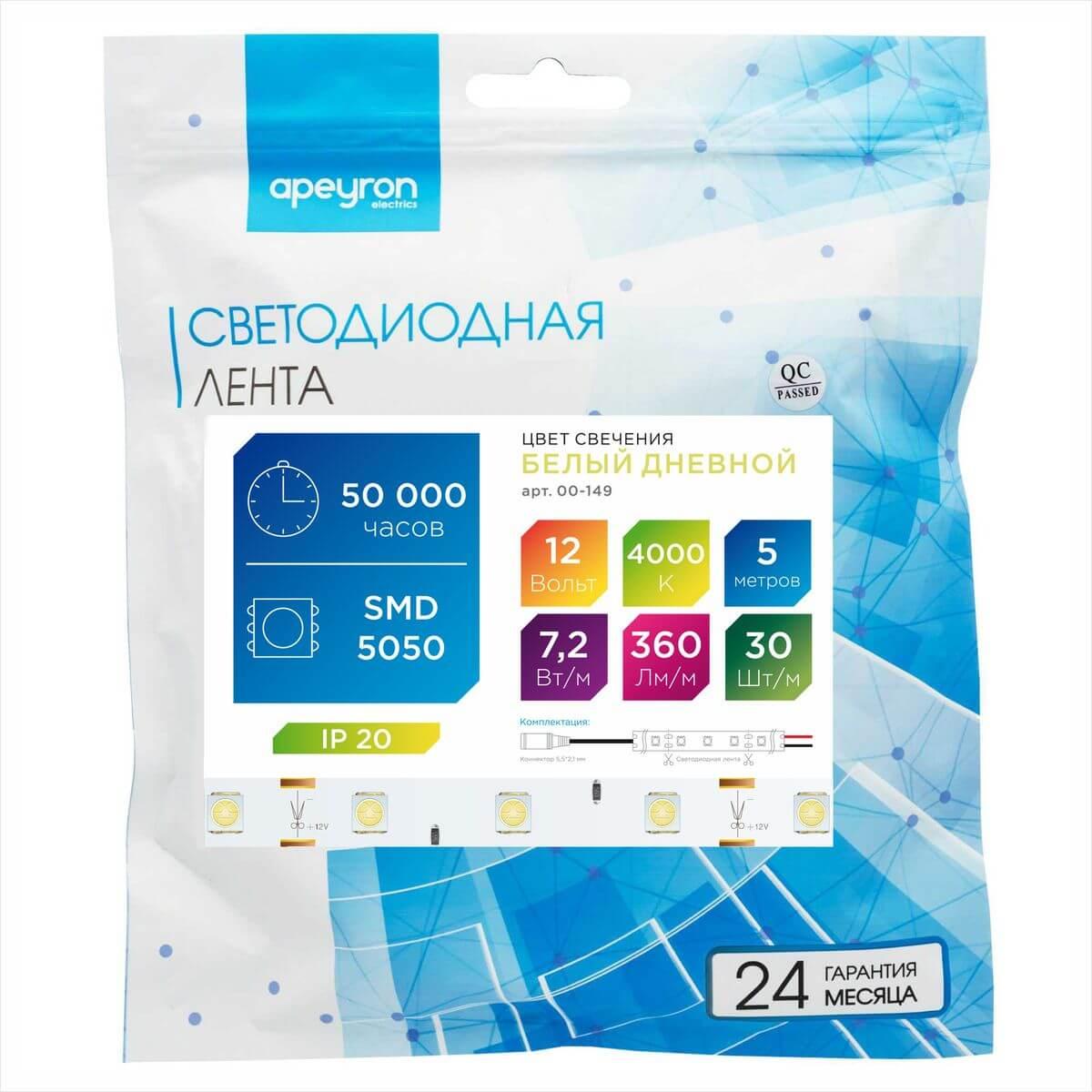 Купить "Лента Apeyron 7,2W/m 30Led/m 5050SMD дневной белый 5M 00-149"