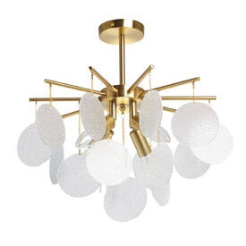 Металлическое основание светильника гальванизировано в цвет золота. Люстра декорирована матированными стеклянными элементами в форме листьев.
