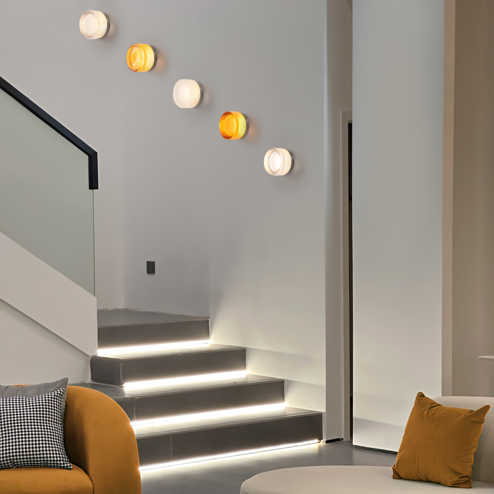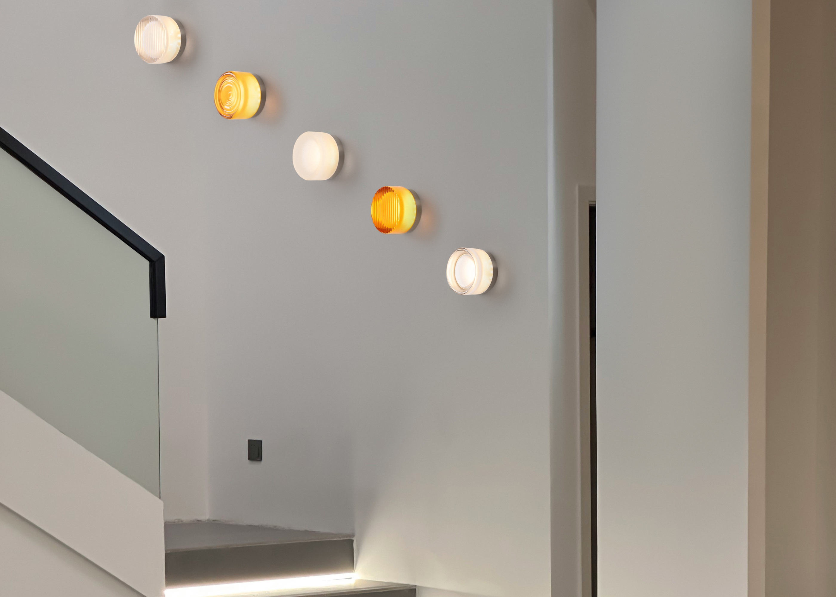 Металлическая арматура в цвете никель в трех рельефных основаниях. Плафоны, выполненные в приглушенно пшеничном и янтарном оттенках, доступны в двух размерах. LED источник света 2400К/2550К/3000K.