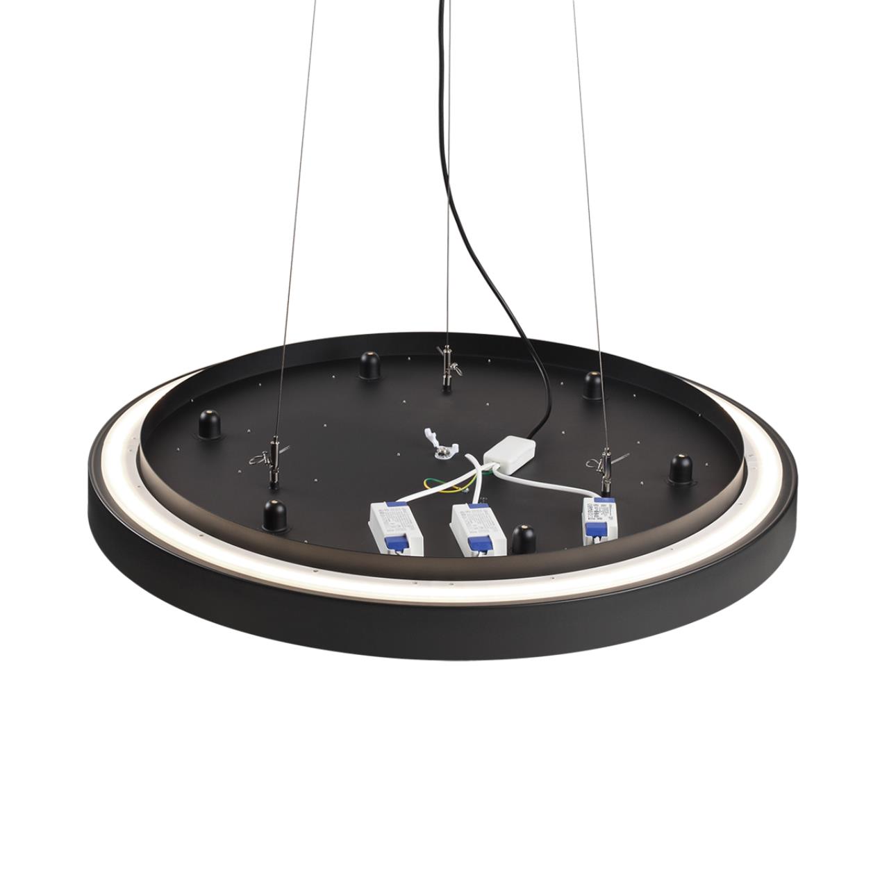 Тросы подвесного крепление для модели QUASAR LED выполнены из металла в приятной на ощупь силиконовой оплетке. Питающий провод и потолочная чаша выполнены в цвете внешнего контура корпуса светильника - угольно-черном.