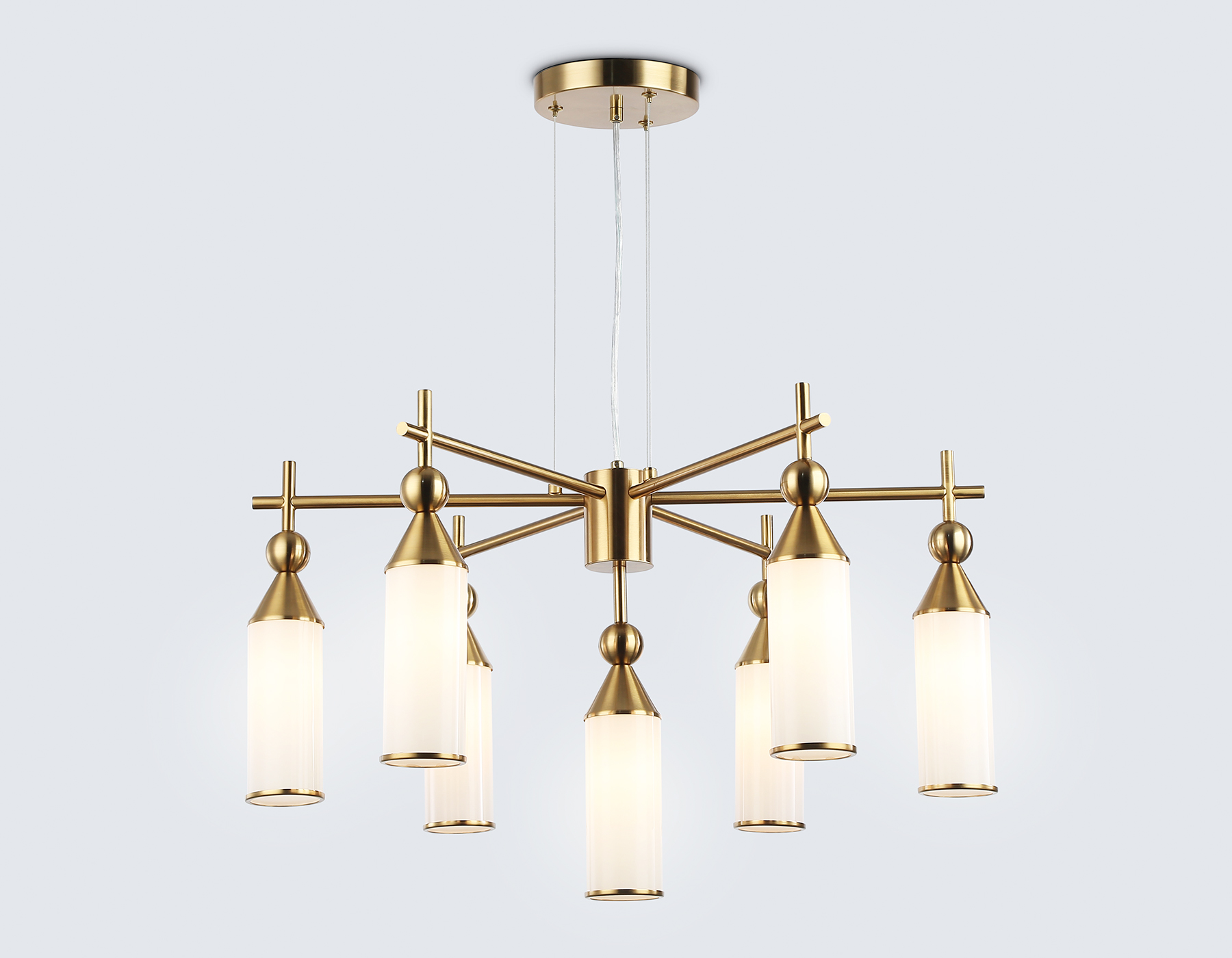Подвесная люстра из коллекции HIGH LIGHT. Модель LH55278 представлена в стиле модерн. ель LH55276 представлена в стиле модерн. Люстра выполнена из плафонов белого матового стекла и металлического каркаса цвета латунь. Для данной модели подойдут лампы с цоколем Е14. Люстра будет прекрасным дополнением в любом помещении.