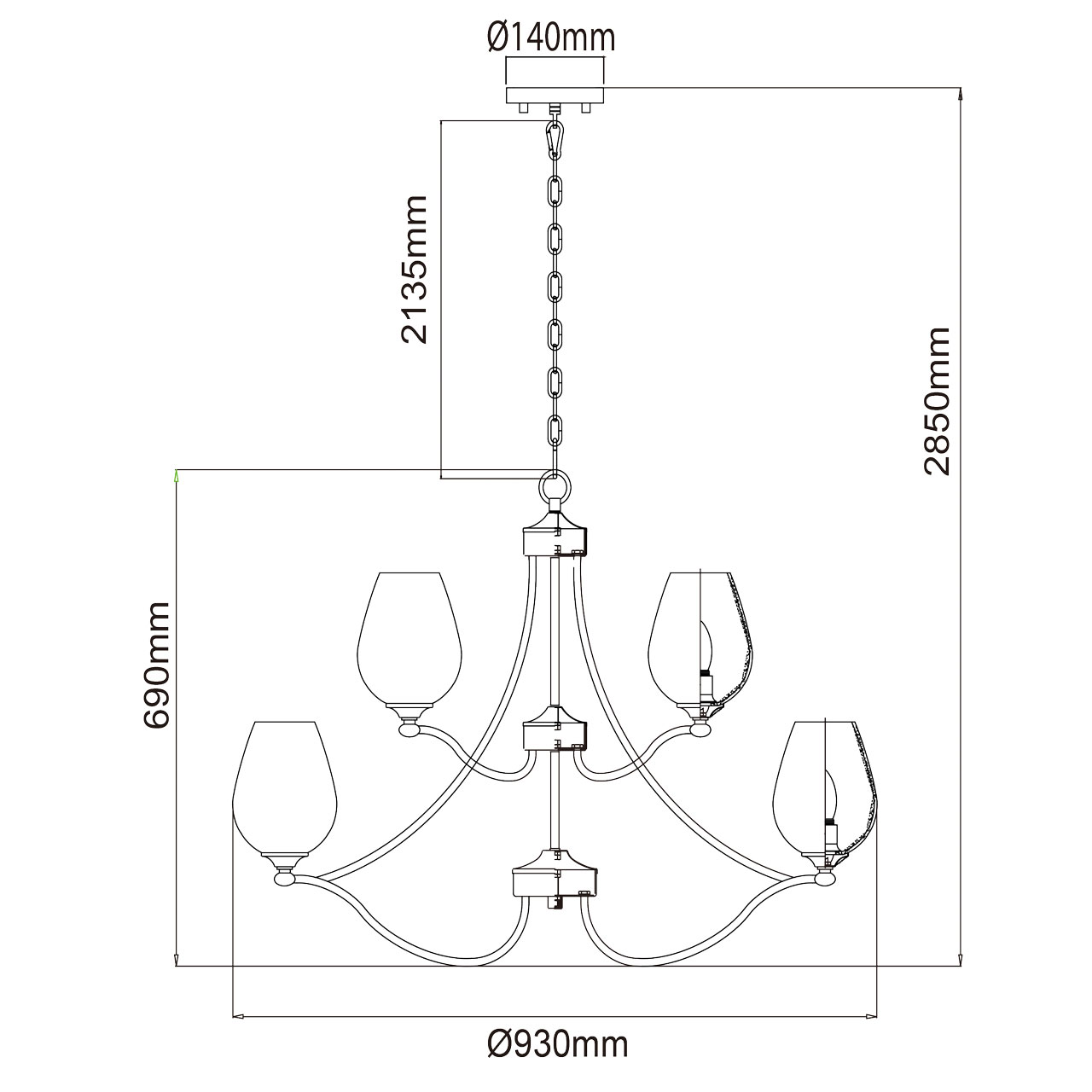 Модель подойдет для комнаты с высокими потолками. Габариты самой люстры составляют 69 см, при этом благодаря подвесу-цепи, ее максимальная высота может достигать 285 см.