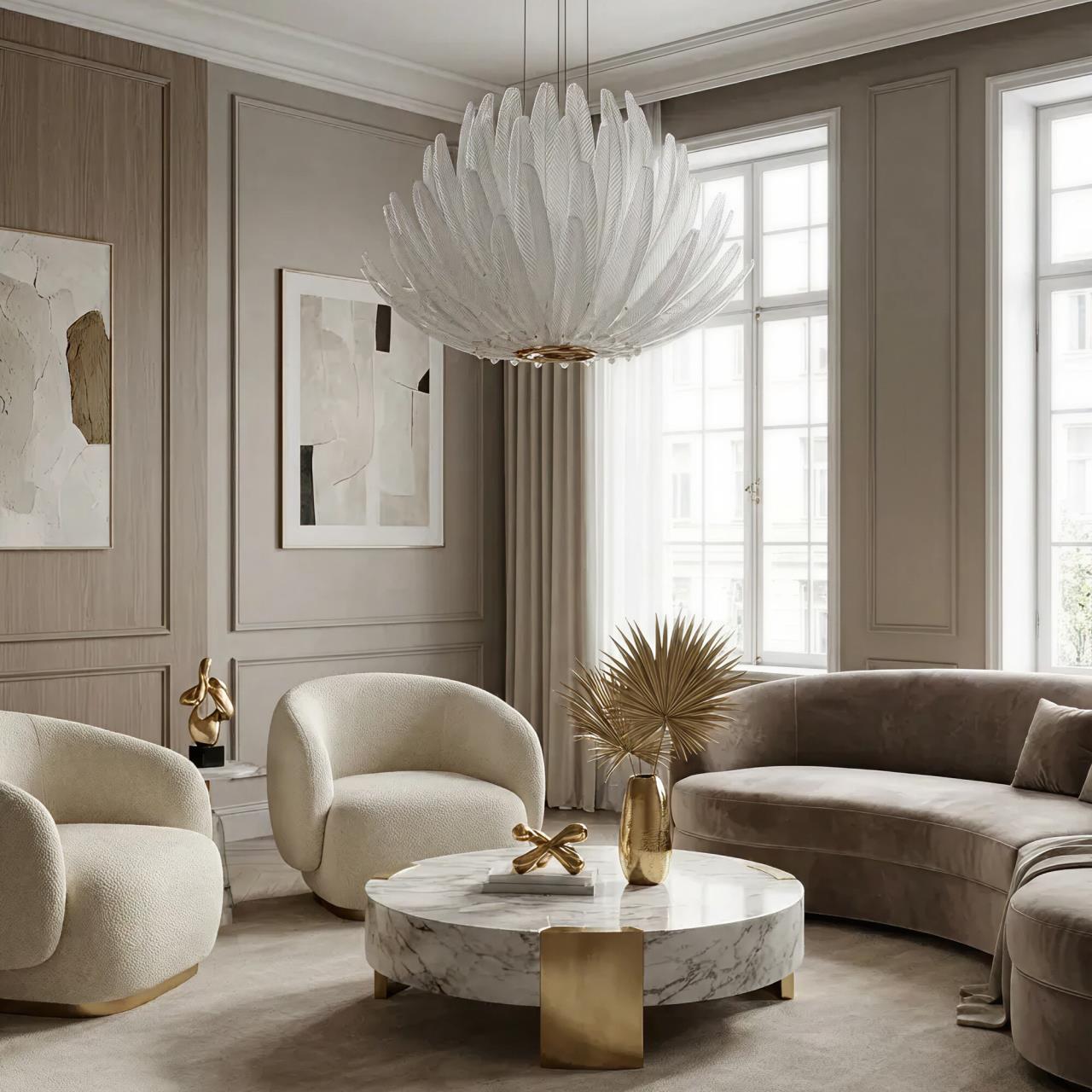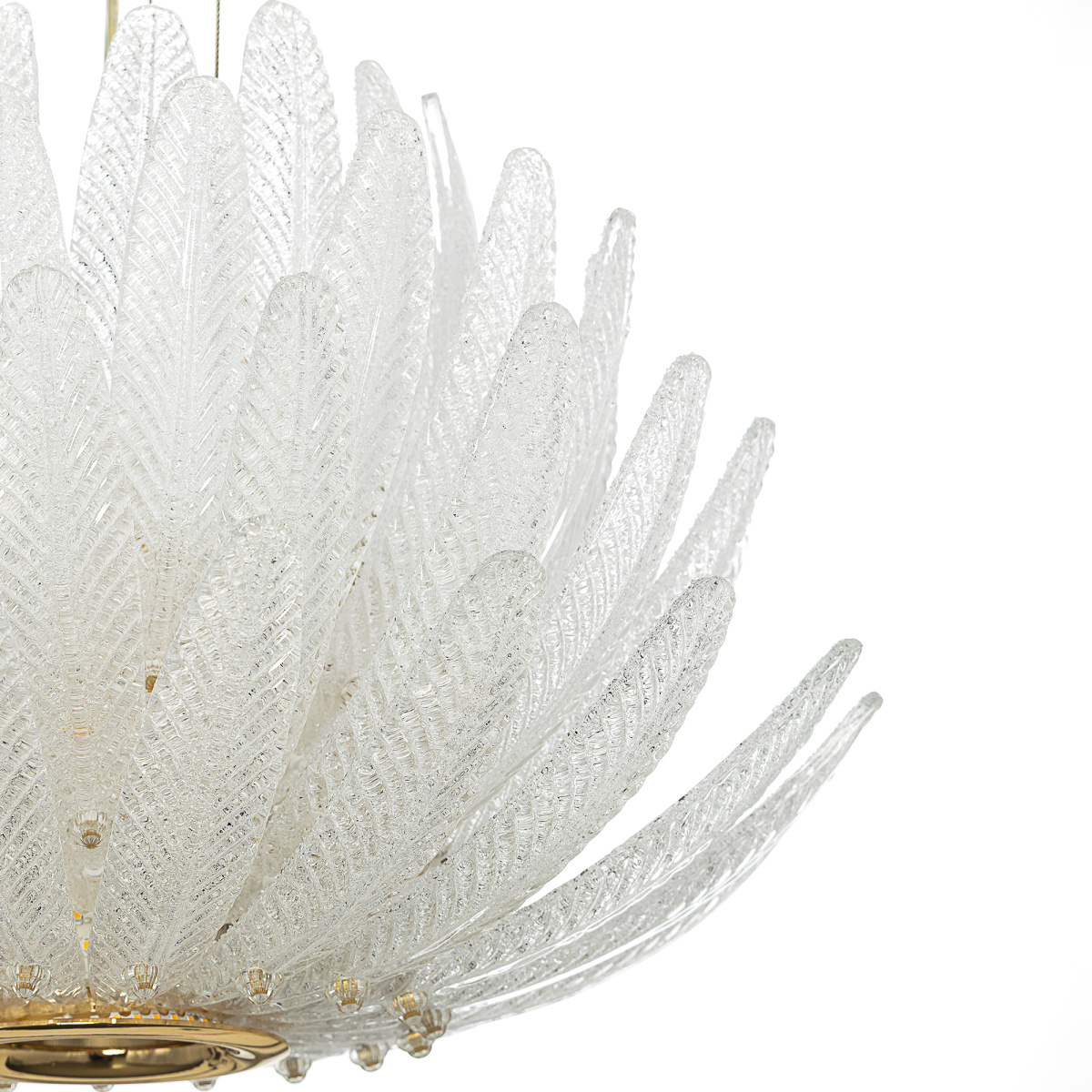 Металлический каркас имеет благородный золотой оттенок, рассеивателем служат несколько рядов полупрозрачных стеклянных текстурных элементов в форме продолговатых листьев. Источником света являются встроенные светодиоды с цветовой температурой 3000К, что соответствует теплому освещению.