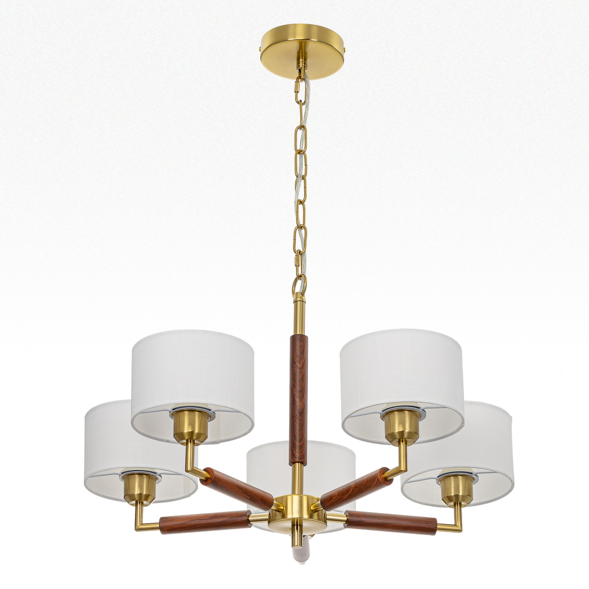 Бронзовый металлический каркас с декоративными элементами с текстурой под дерево. Пять рожков с абажурами в форме цилиндра, изготовленных из молочно-белой ткани с чуть шероховатой текстурой.