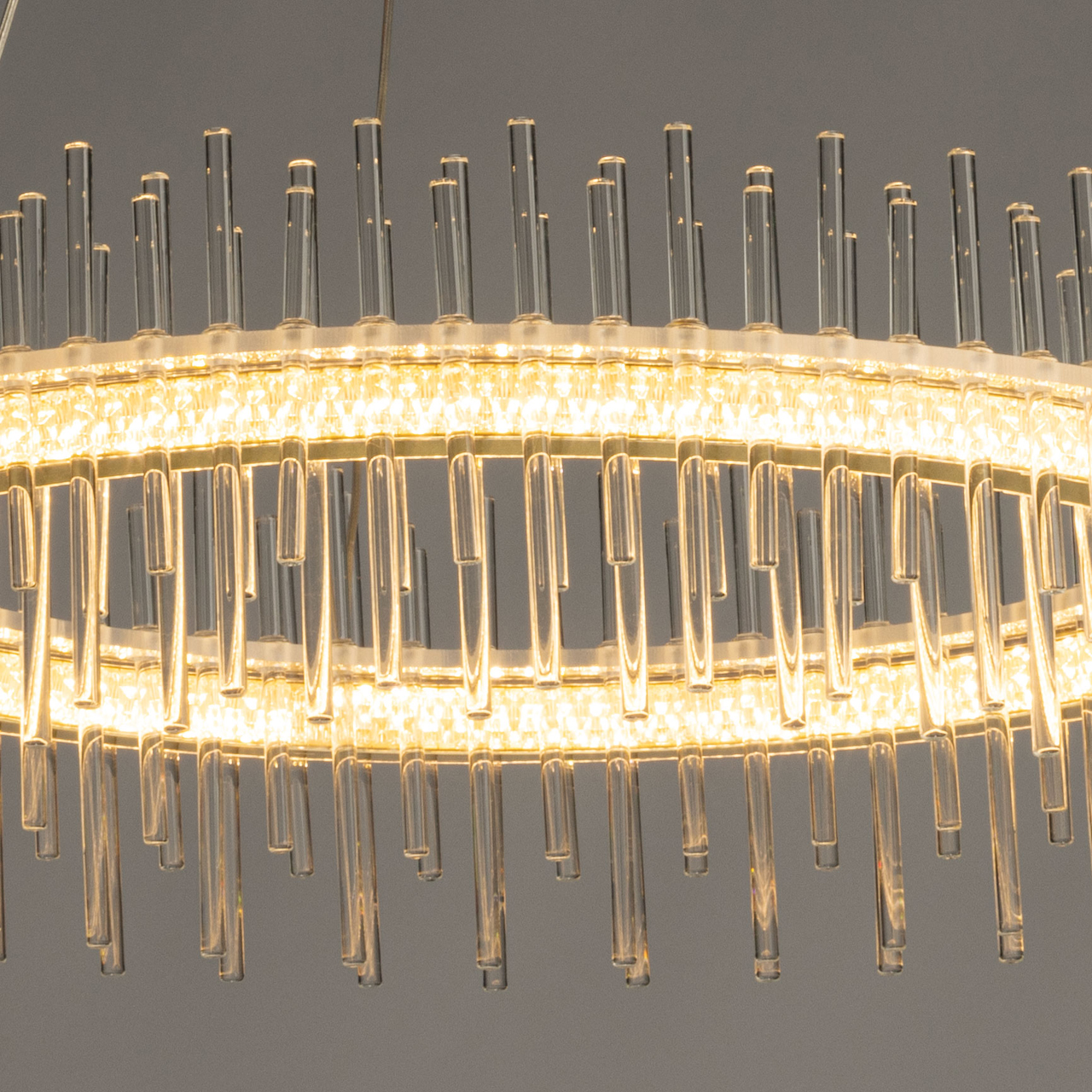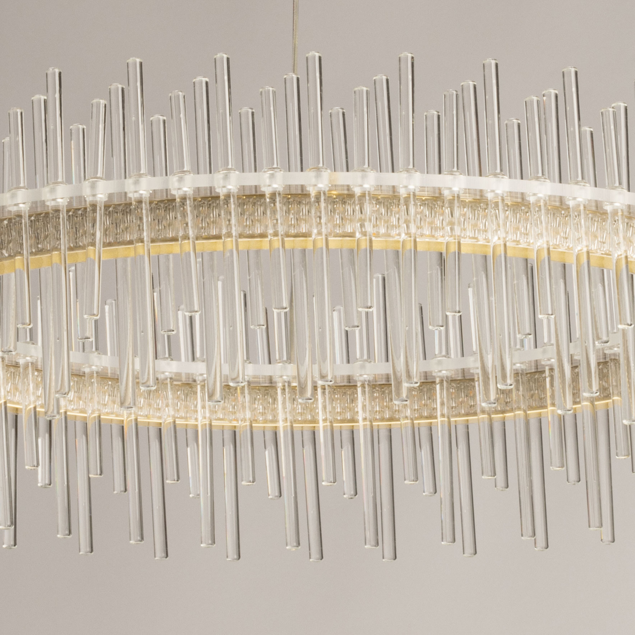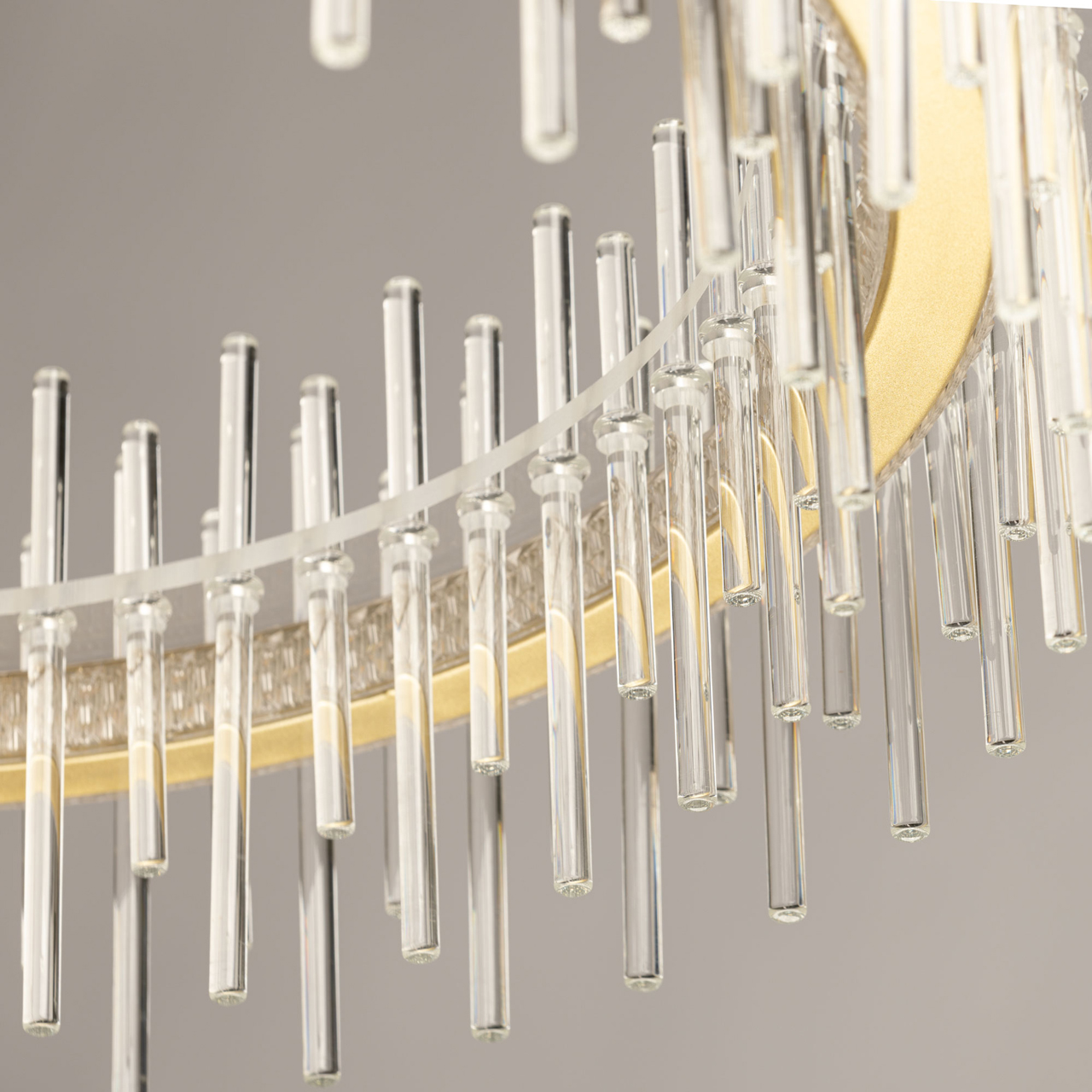 Металлическое основание подвесной люстры окрашено в цвет золота. Светильник декорирован трубочками из прозрачного стекла. Светодиодные источники закрыты прозрачным акрилом.