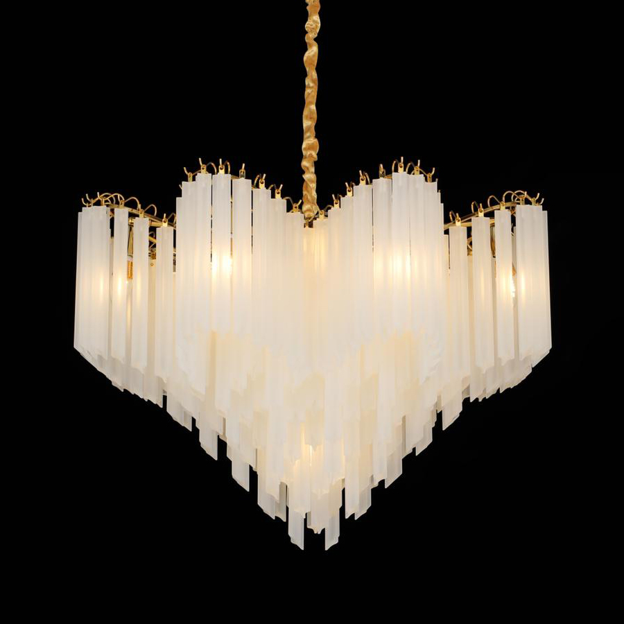 Люстра Delight Collection 17965-800 gold с множеством длинных подвесок с фигурным сечением. Подвески выполнены из матового стекла. Металлические части золотого цвета.