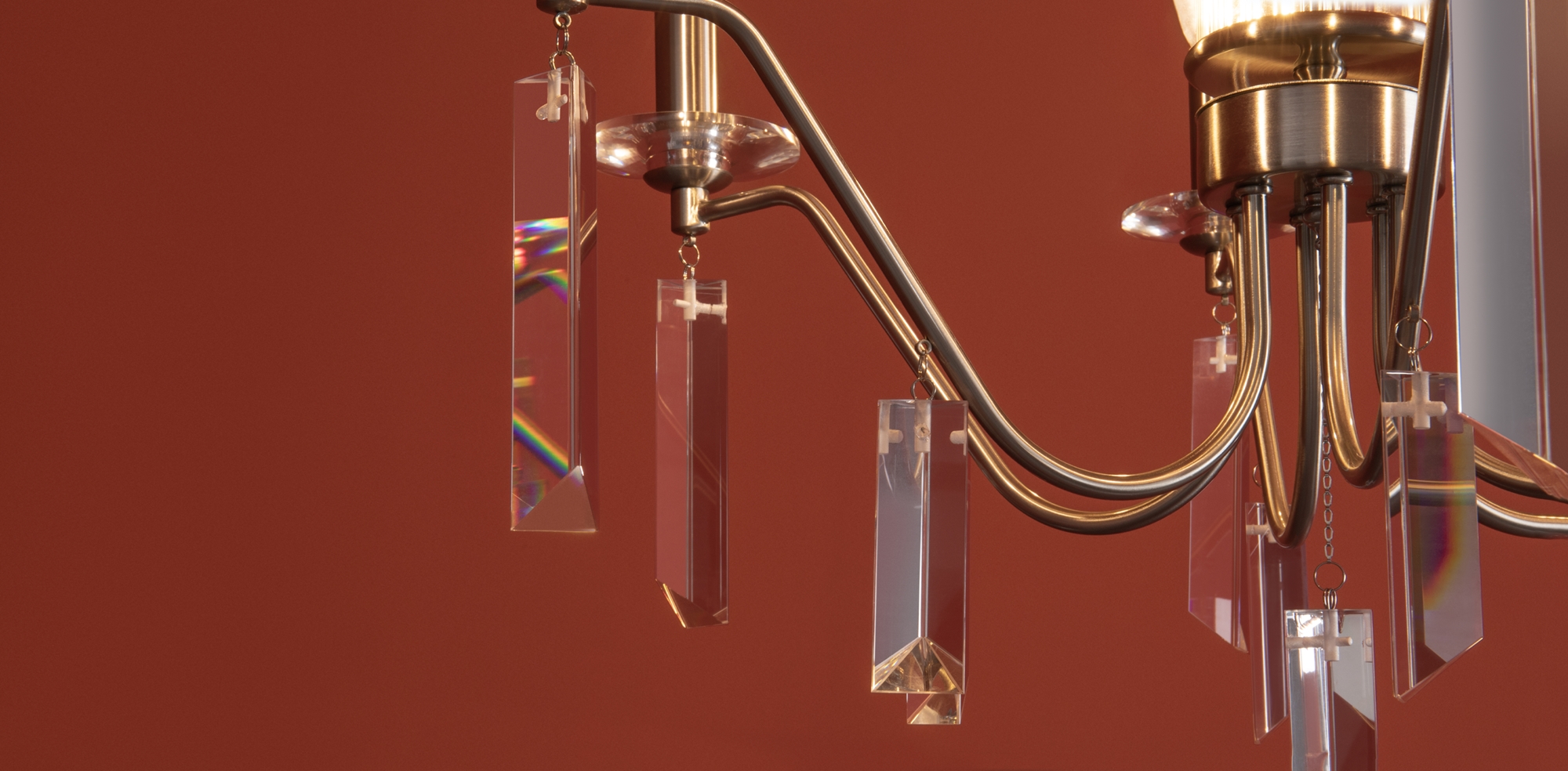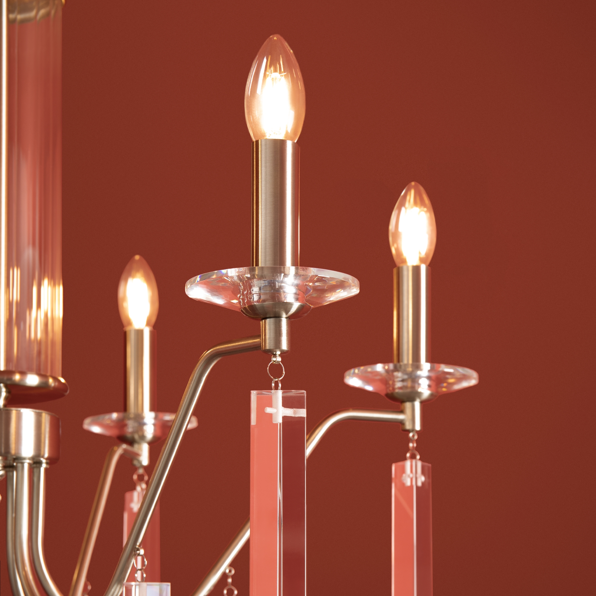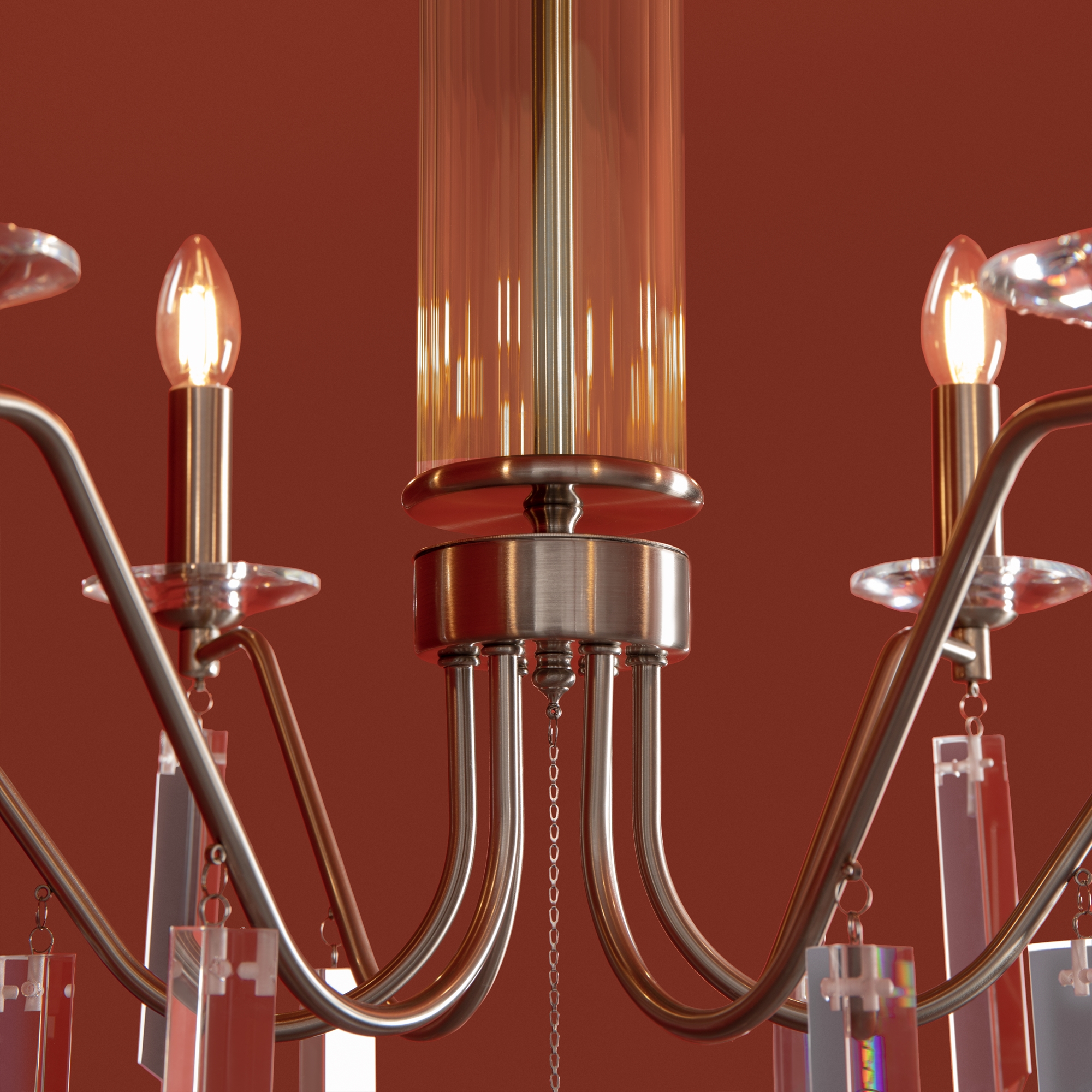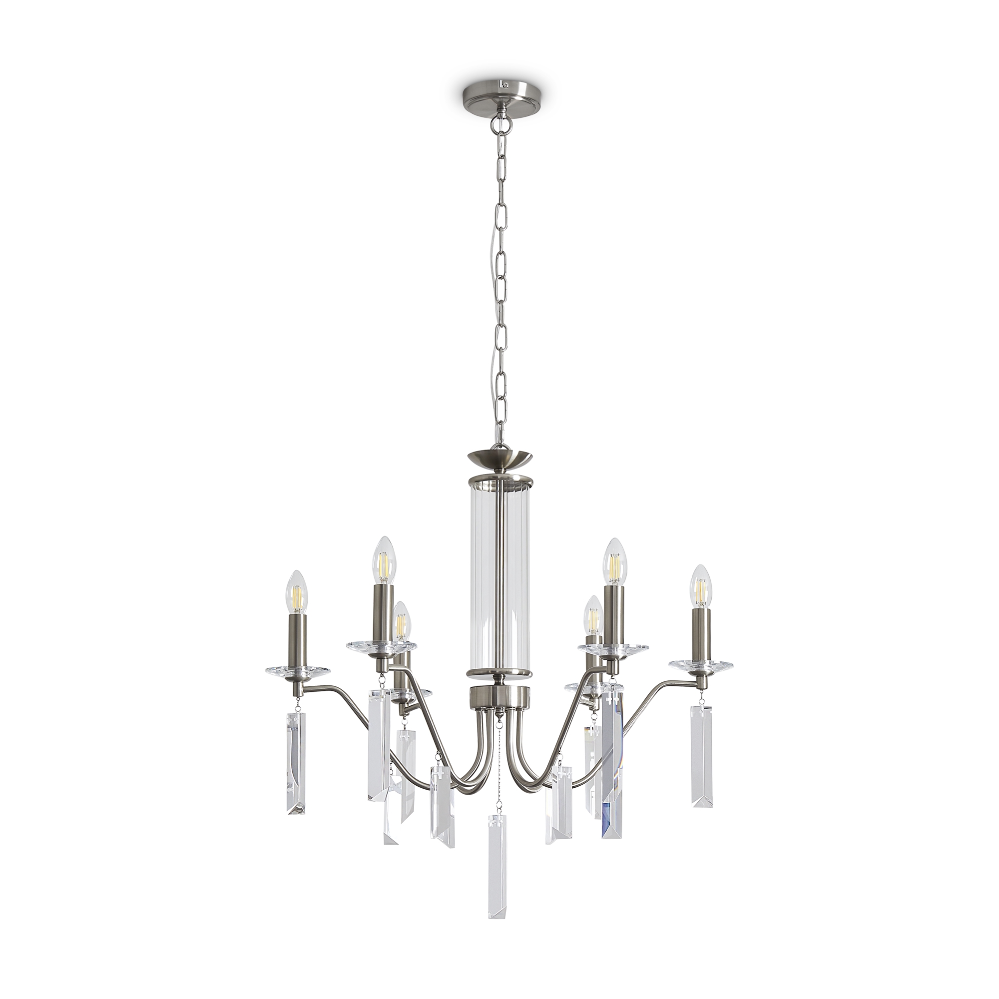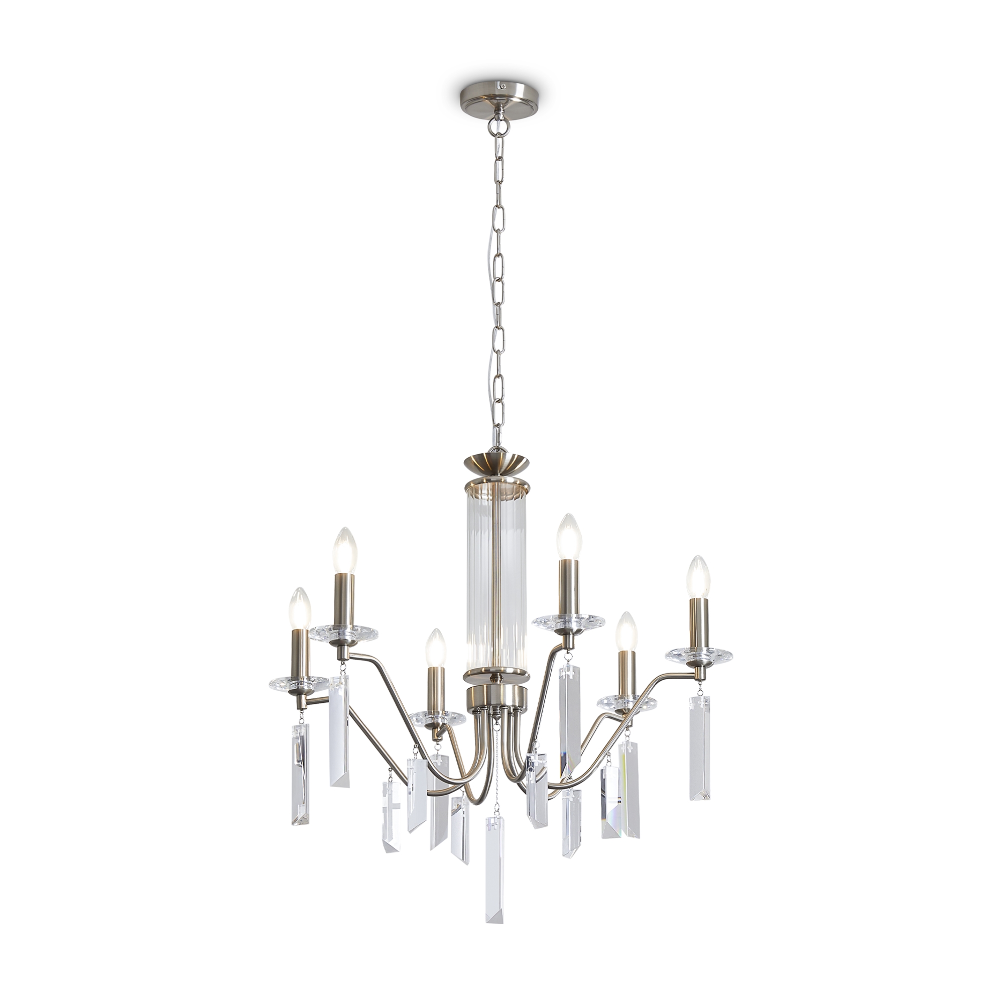 Материал арматуры — металл, цвет — никель или латунь. Подвесные светильники с цоколем E14. Доступны с пятью или шестью источниками света. Грани хрустальных подвесов создают эффект перелива радуги. Центральный декор из стеклянных трубок. Подходит для классических интерьеров.