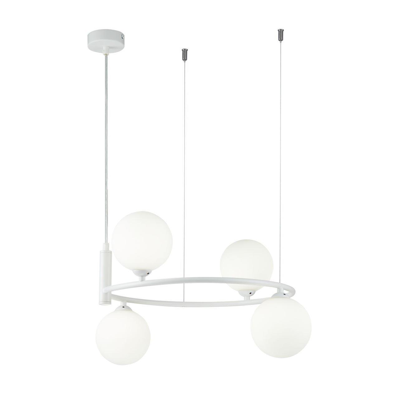 Подвесная люстра Maytoni Ring MOD013PL-04W, входящая в коллекцию Modern, отлично подойдет для освещения пространства в гостиной, на кухне, на даче, в кабинете, в баре, кафе и ресторане, оформленных в современном, в скандинавском стиле или в стиле Хай-тек. Данный артикул имеет четыре плафона белого цвета в форме шара, выполненных из стекла и направленных вниз и вверх, а также матовую белую арматуру, изготовленную из металла. Немецкий производитель Maytoni дает гарантию на свое изделие 2 года и рекомендует использовать для устройства энергосберегающие лампы с цоколем G9 по 25 Вт каждая лампа и общей мощностью 100 Вт, что позволяет осветить помещение площадью 5,6 кв. м. Технической особенностью этого осветительного прибора является возможность регулирования по высоте, при этом максимальная высота люстры составляет 184 см. Способ крепления светильника к потолку на планку позволяет быстро и просто осуществить монтаж, при этом подходит для всех типов потолков, в том числе и натяжных. Стильный дизайн, тип подвеса на тросиках и матовая поверхность подвесной люстры Maytoni Ring MOD013PL-04W делают ее особенным элементом декора, который украсит любое интерьерное пространство.