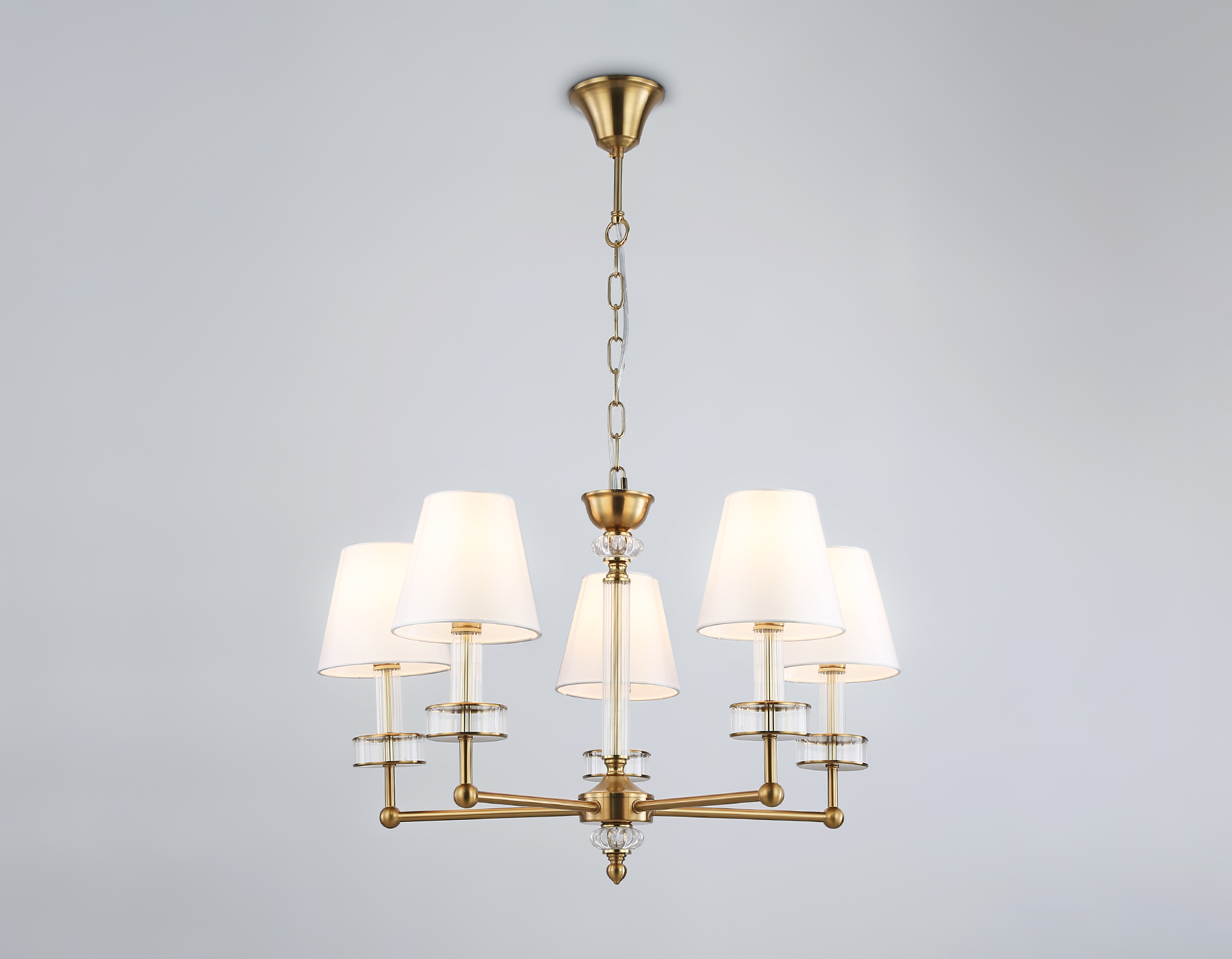 Подвесная люстра с абажурами и хрусталем из коллекции HIGH LIGHT. Модель LH71021 представлена в стиле неоклассика. Люстра выполнена из металла цвета латунь, тканевых плафонов белого цвета и декорирована превосходным прозрачным хрусталем. Для данной модели подойдут лампы с цоколем Е14. Люстра будет прекрасным дополнением в любом помещении.