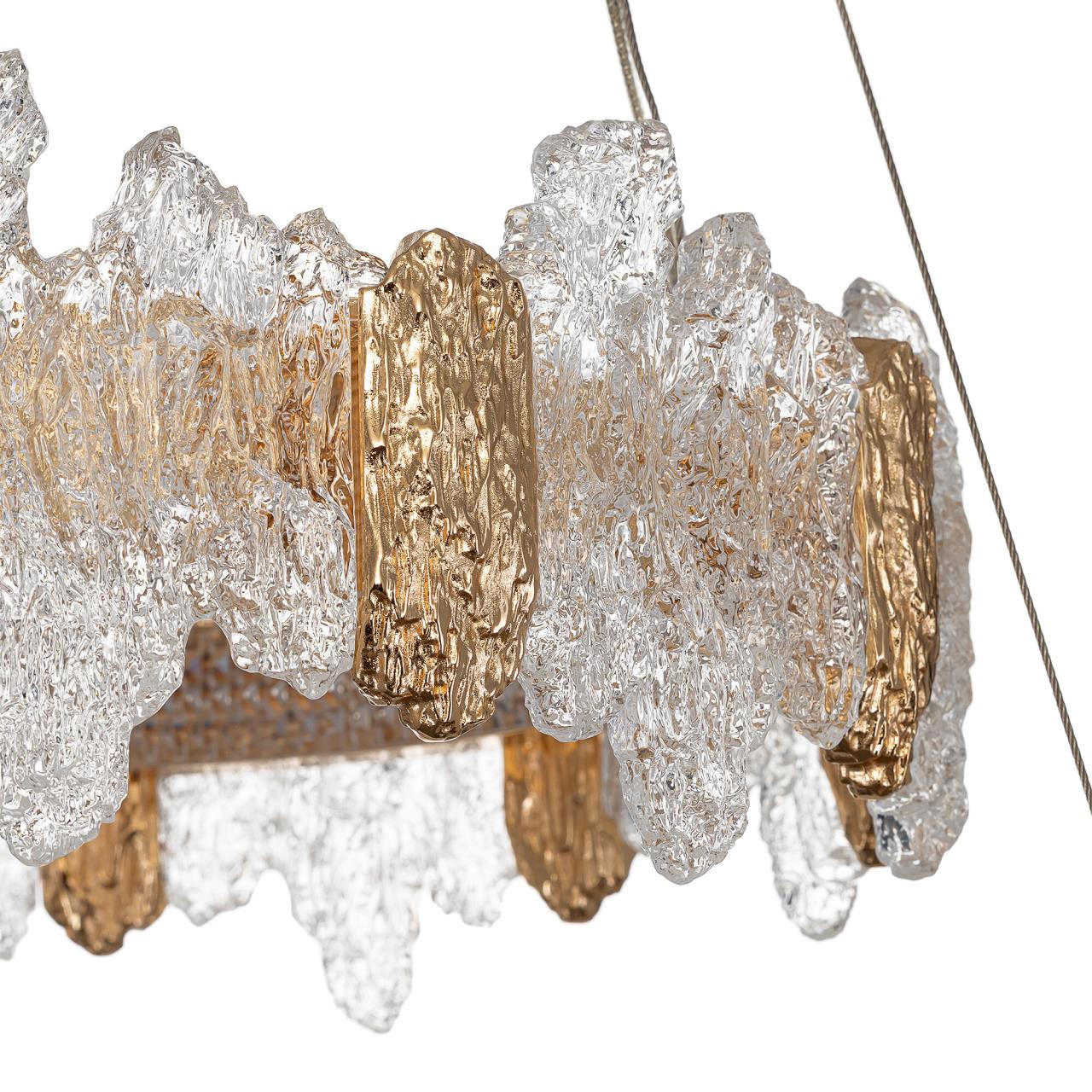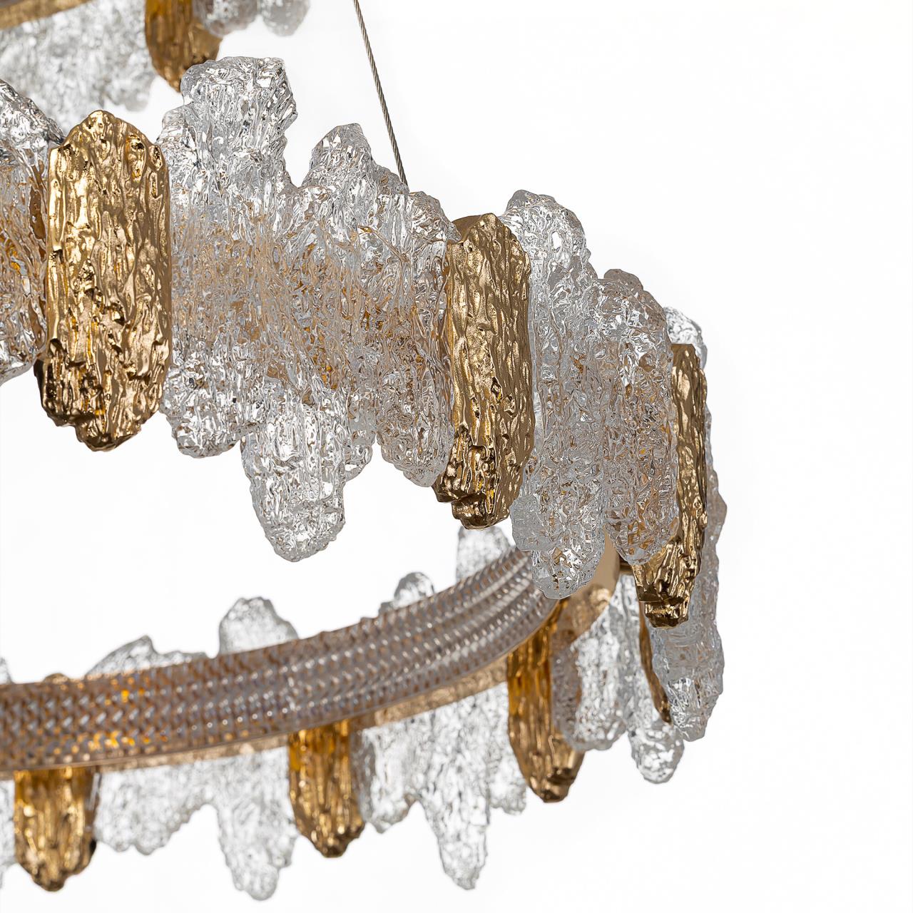 Каркас люстры — металлический, роскошного золотистого оттенка. Два подвесных кольца закреплены на тонких тросах и будто парят в воздухе. Рассеиватель из оптического полимера имеет оригинальную форму, напоминающую потоки застывшей лавы. Люстра подойдет к любому типу потолка, включая натяжные конструкции, высоту подвеса можно легко изменить.