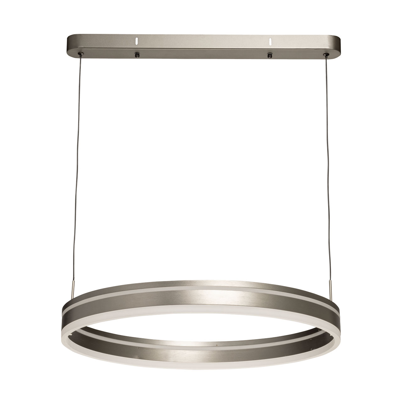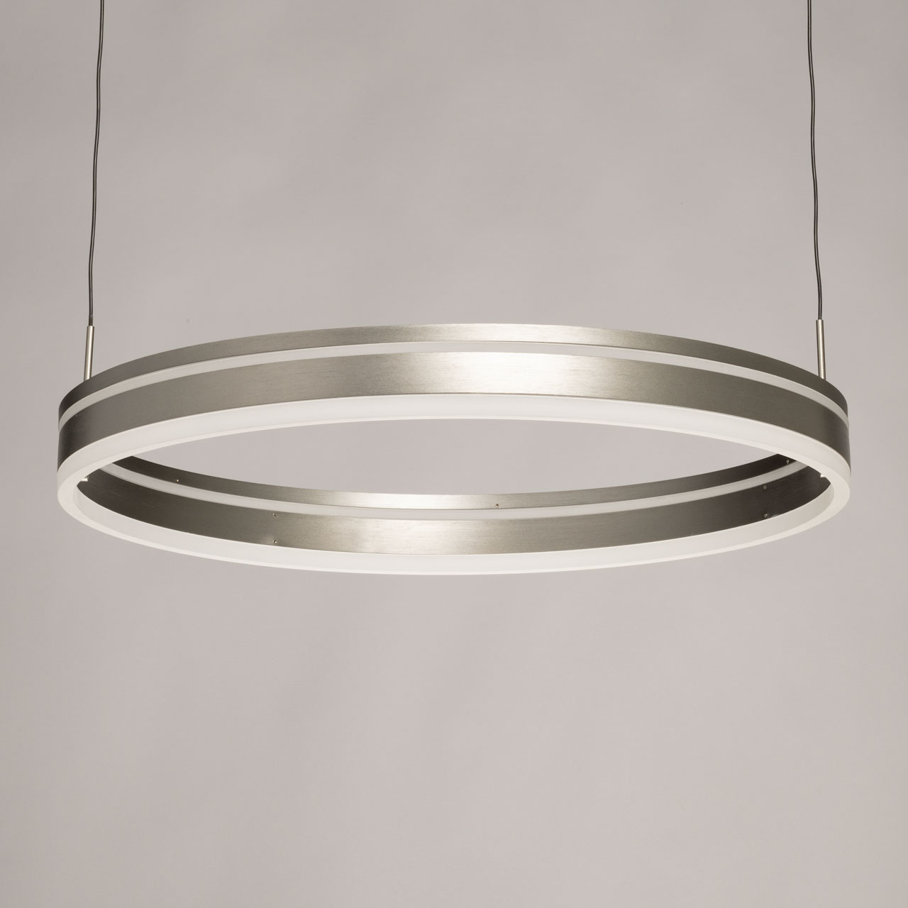Металлическое основание подвесной люстры окрашено в черный цвет. Плафон люстры выполнен из сплава алюминия с цинком и гальванизирован в цвет графита. Светодиодные источники света закрыты белым матовым акрилом.