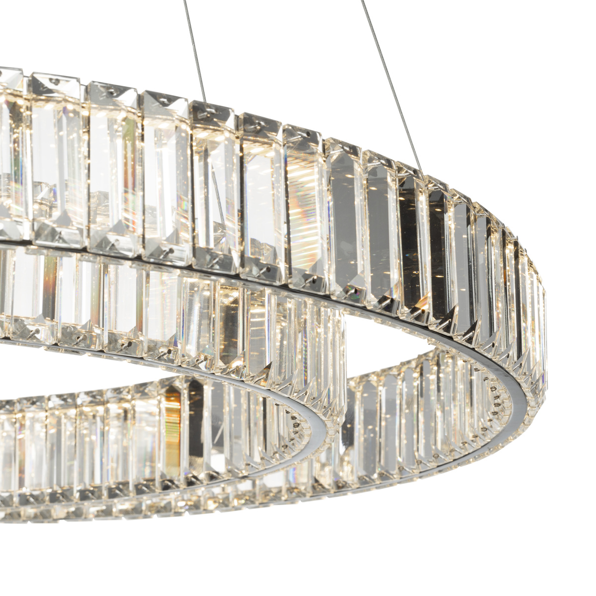 Хрустальная светодиодная люстра CL338281 от производителя Citilux пренадлежит коллекции Чезаре истинное произведение искусства, которое не оставит равнодушными даже самых требовательных ценителей красоты. Основание круглой формы, цвет хром. Два хрустальных кольца на металлическом каркасе, подвешены на элегантных тросиках и словно парит в воздухе. Хрустальные элементы являются воплощением кристальной прозрачности и современной огранки, они играют сияющими отблесками света и создают неповторимую атмосферу роскоши и элегантности. Высота подвесной модели легко регулируется в диапазоне от 40см до 1,5м, что делает ее идеальным решением для помещений с высокими, стандартными и низкими потолками. Диаметр внешнего кольца 800мм, внутреннего 600мм. Мощность изделия 110Вт, что позволяет ей осветить площадь до 30м², создавая при этом яркое и равномерное освещение. Особенностью светильника является возможность управления с помощью пульта дистанционного управления - можно регулировать яркость света от 10% до 100%, выбирать цветовую температуру в диапазоне от 3000 до 5500 К и наслаждаться теплыми, нейтральными или холодными оттенками света, есть режимы памяти и ночника. Всё это делает использование люстры Чезаре еще более комфортным и удобным , страна бренда Дания.Купить модель CL338281 спешите в интернет-магазине 220svet.