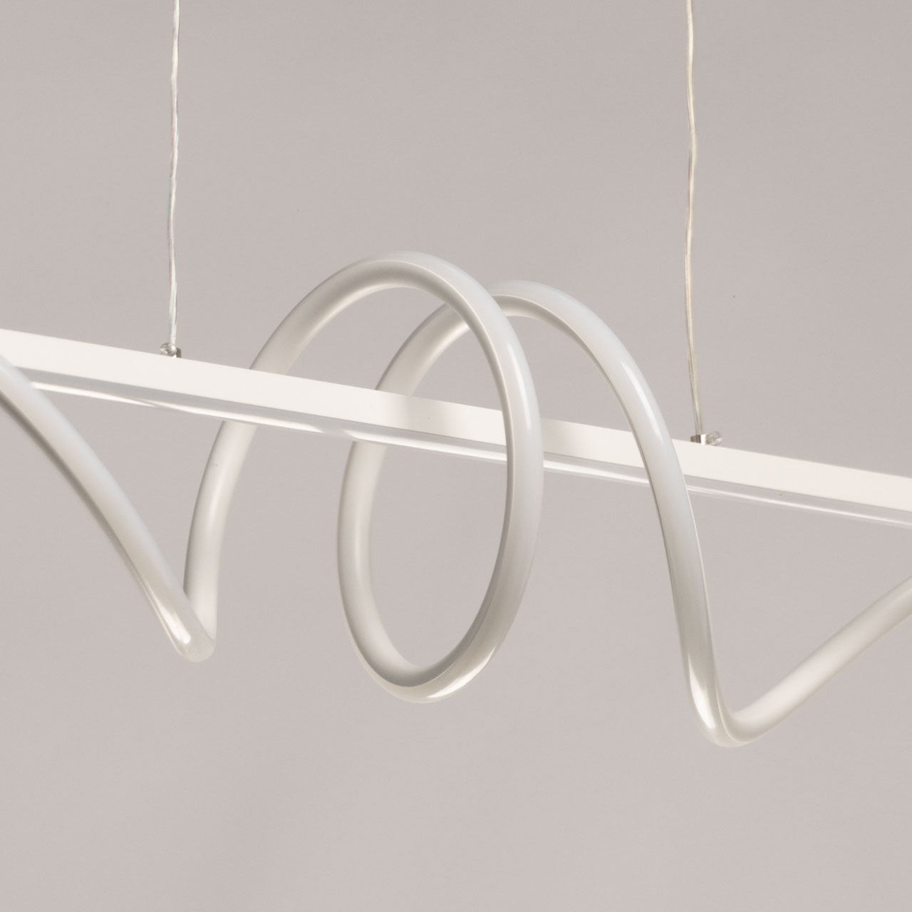 Металлическое основание потолочной люстры окрашено в белый цвет. Плафон люстры выполнен из сплава алюминия с цинком и окрашен в цвет основания. Светодиодные источники света закрыты белым акрилом.
