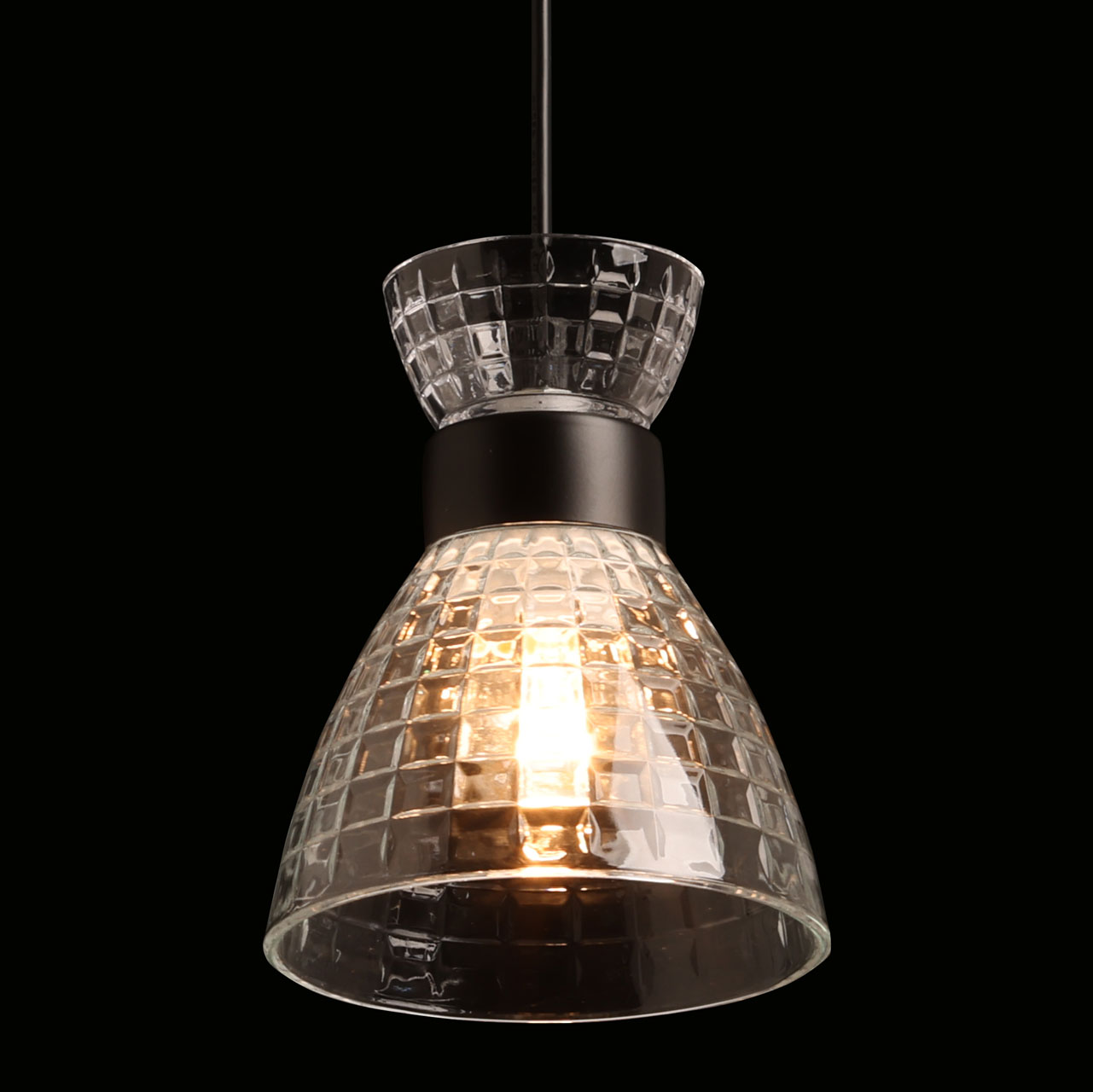 Металлическое основание подвеса окрашено в черный цвет. Прозрачный стеклянный плафон с геометричной фактурой отлит в сложную форму.