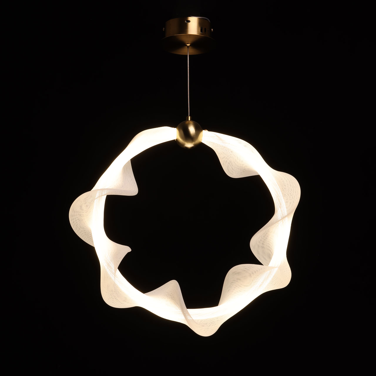Металлическое основание подвеса гальванизировано в цвет бронзы. Светодиодный источник света закрыт белым матовым акрилом и оригинальным плафоном в виде волны. Волна плафона выполнена из акрила ячеечной структуры.