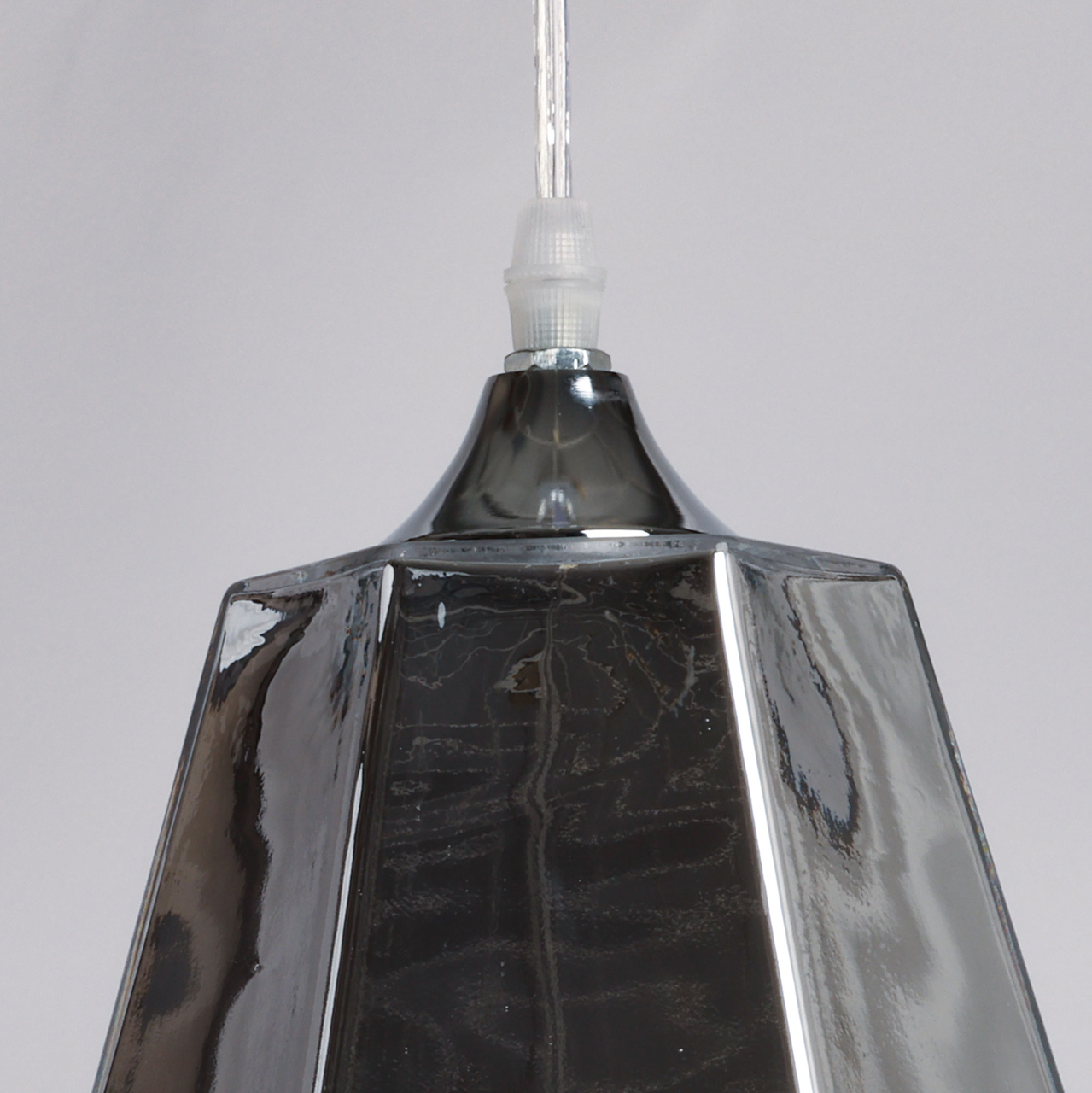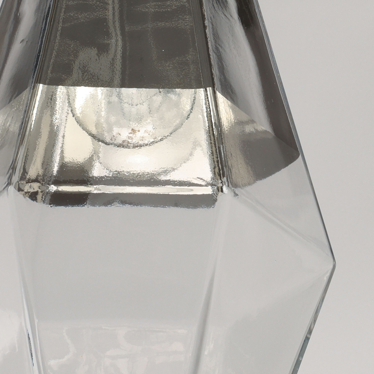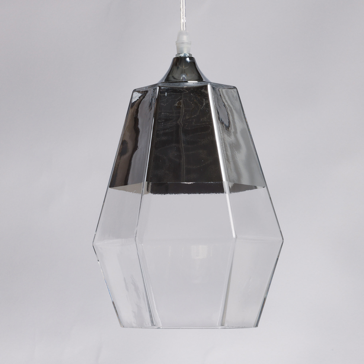 Металлическое основание подвеса гальванизировано в цвет хрома. Плафон выполнен из прозрачного стекла, частично гальванизированного в верхней части в цвет хрома.