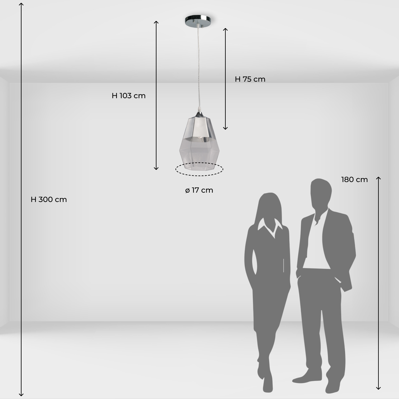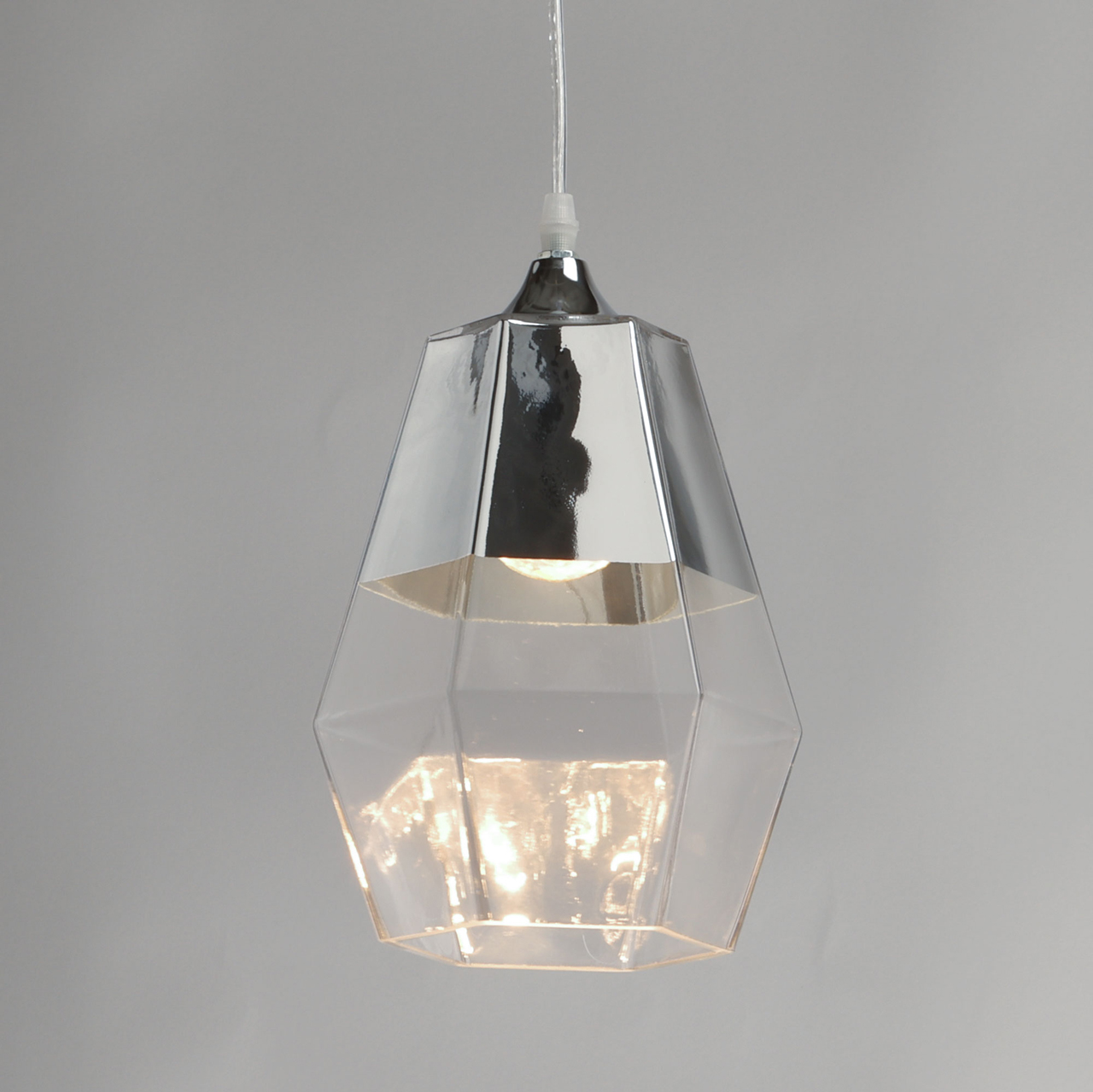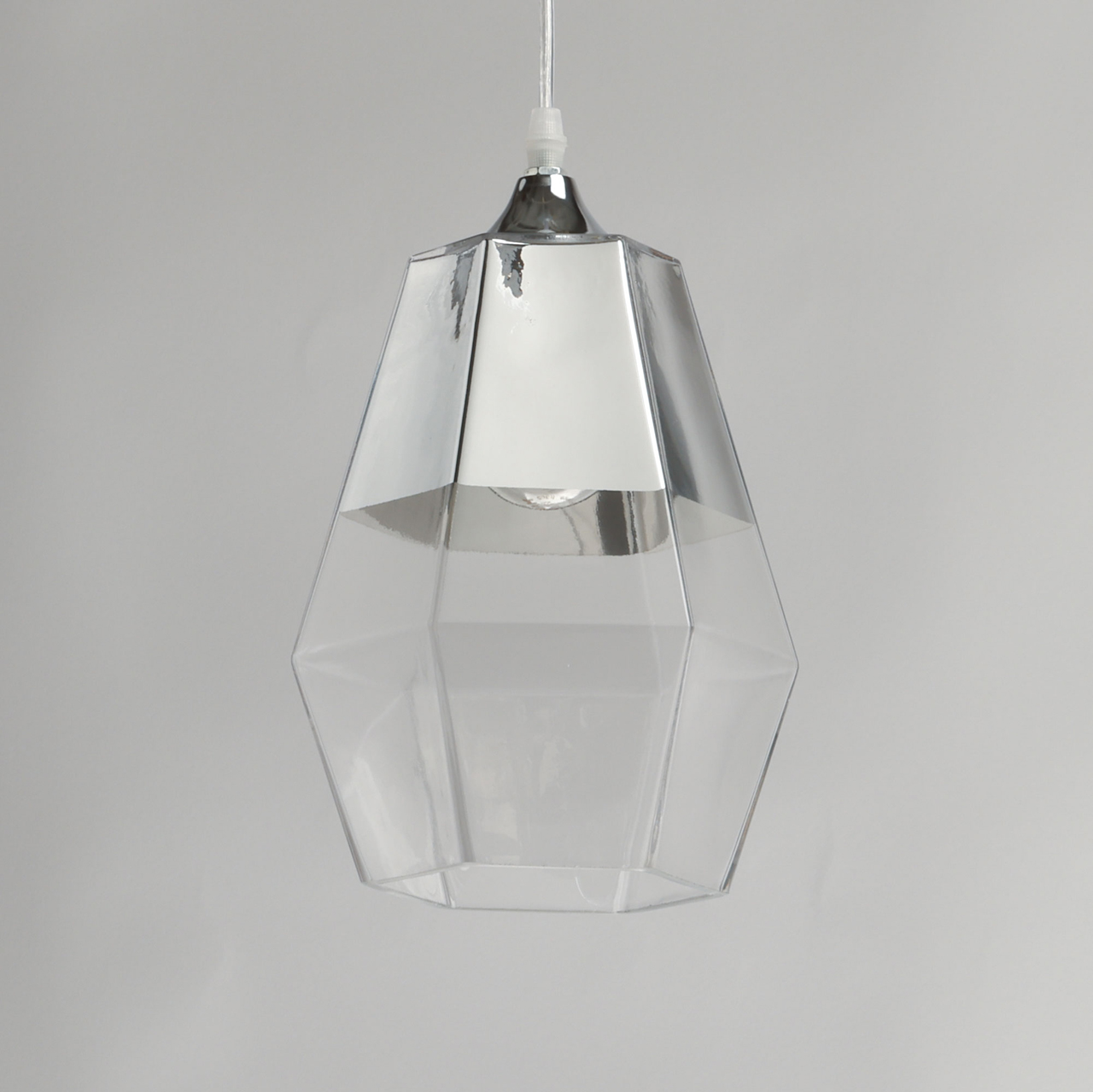 Металлическое основание подвеса гальванизировано в цвет хрома. Плафон выполнен из прозрачного стекла, частично гальванизированного в верхней части в цвет хрома.