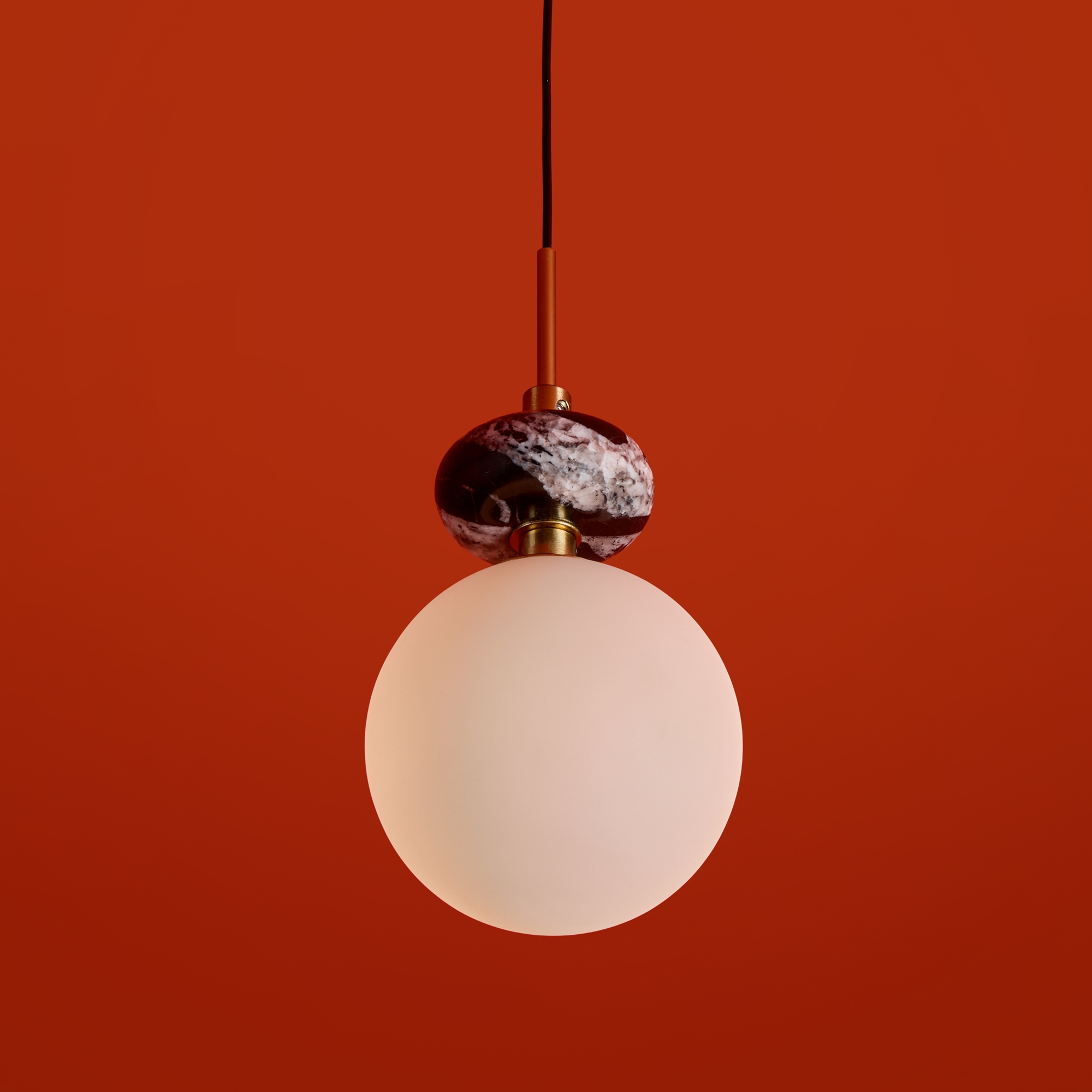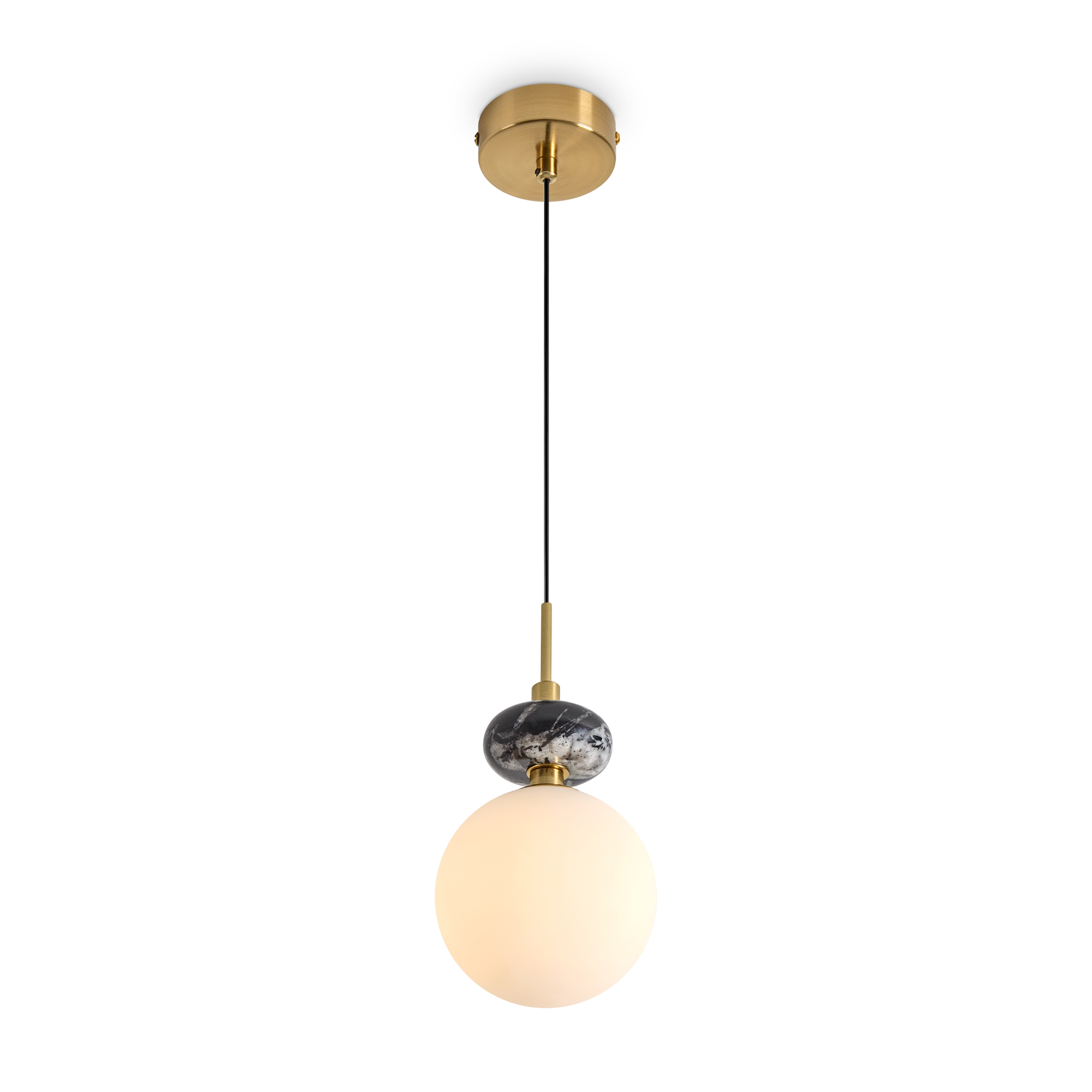 Арматура — металл. Плафоны из алебастра/камня и матового белого стекла. Версии с лампами G9 (не в комплекте) и с LED источником света. Высота регулируется.