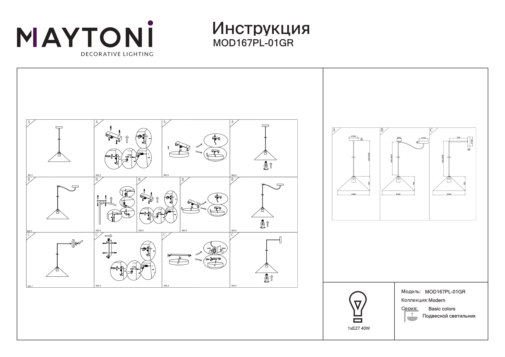 Материал арматуры - металл. Цвета - черный, белый, а также два актуальных оттенка серого. Универсальные и базовые формы плафонов. В комплекте: крюк, дополнительное основание и металлический элемент, которые позволяют закрепить подвес в нужной зоне или использовать его в качестве бра. Цоколь Е27. Лампы не входят в комлпект.