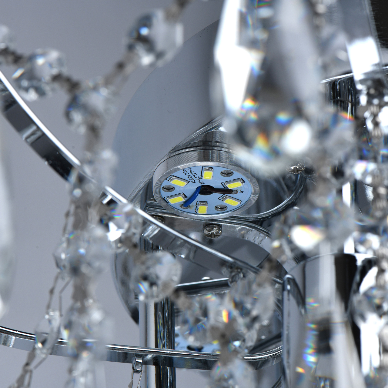 Основание светильника выполнено из металла и гальванизировано в цвет хрома. Светильник декорирован прозрачным хрусталем формы октагон и капля.