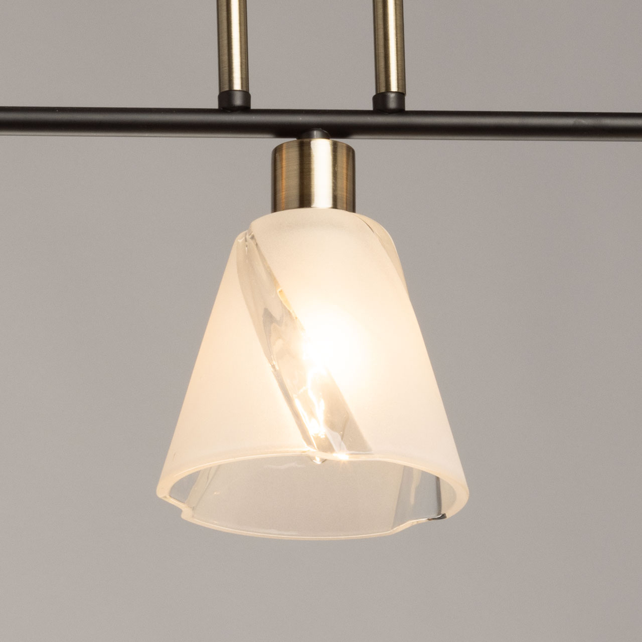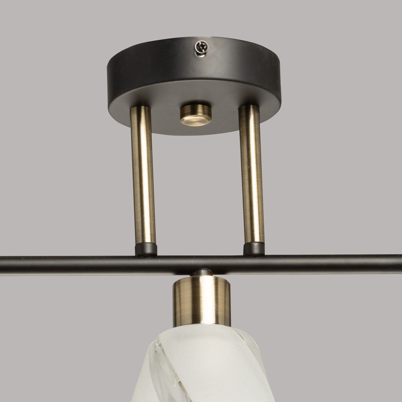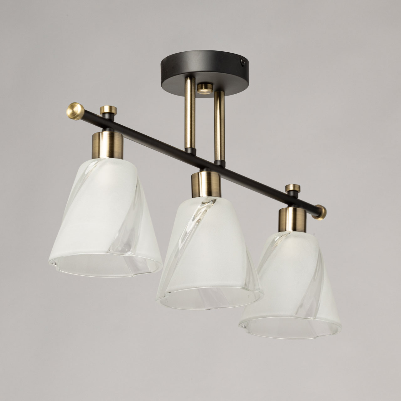 Основание светильника выполнено из металла и окрашено в черный цвет. Отдельные элементы основания гальванизированы в цвет античной бронзы. Стеклянные плафоны отлиты в сложную форму и матированы в белый цвет.