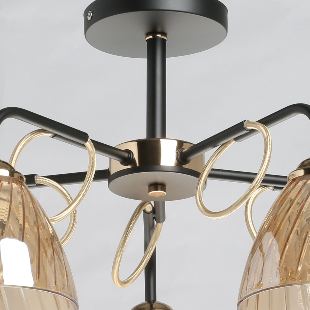 Металлическое основание потолочного светильника окрашено в черный цвет. Отдельные элементы гальванизированы в цвет золота. Стеклянные плафоны выдуваются в сложную форму и гальванизированы в цвет шампань