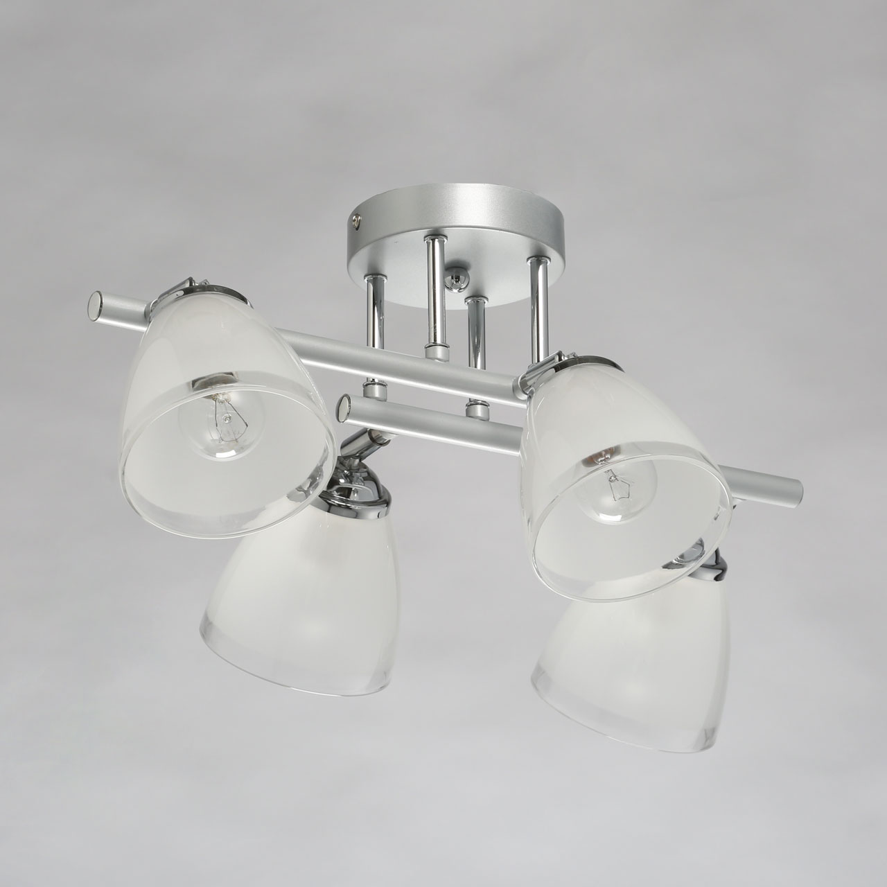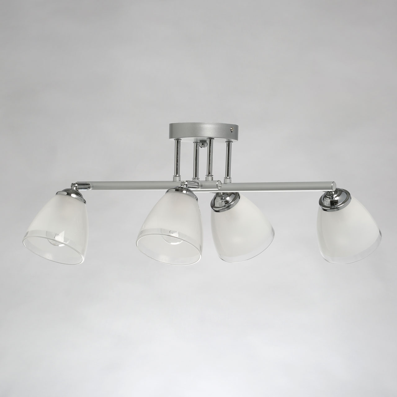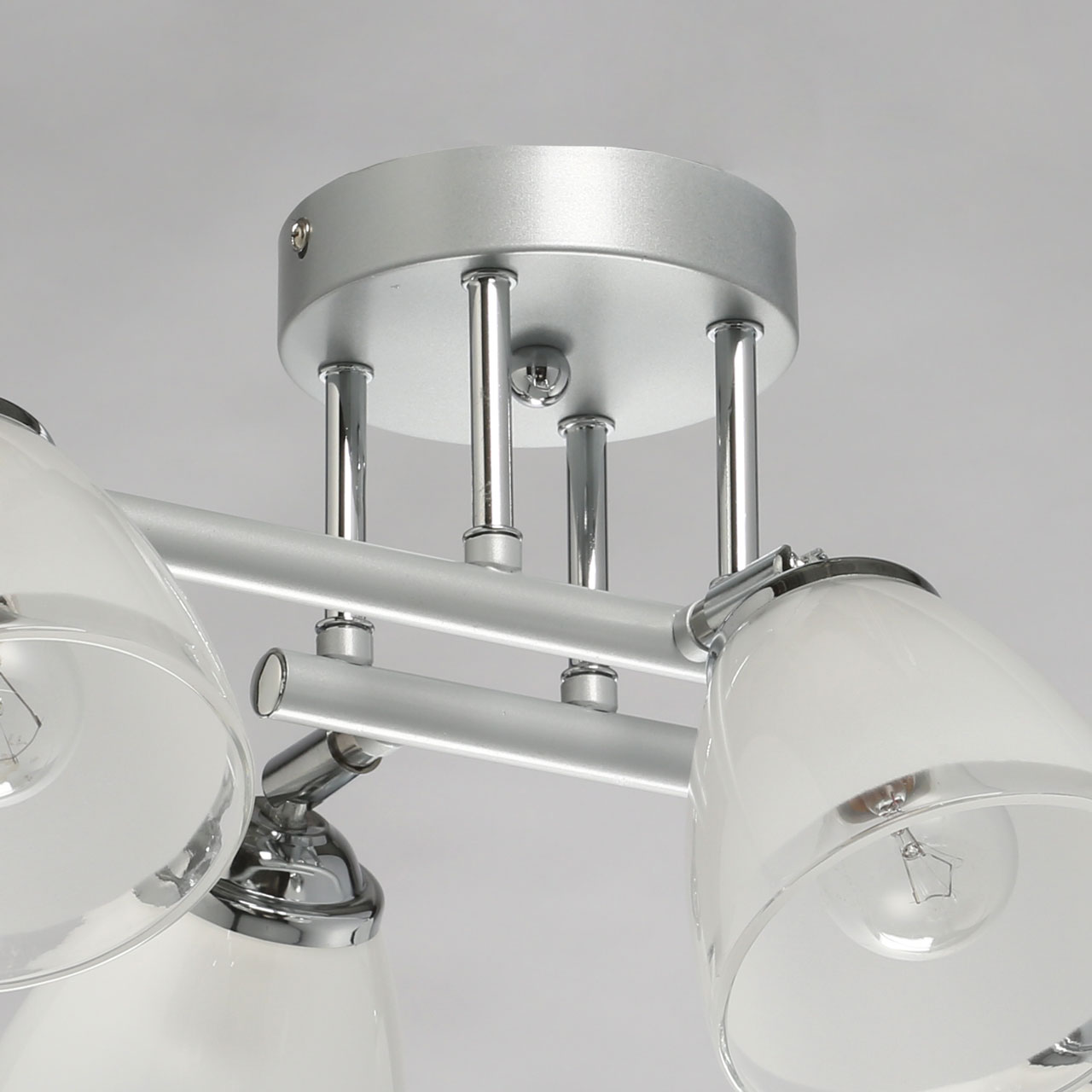 Металлическое основание светильника окрашено в серый цвет. Отдельные элементы основания гальванизированы в цвет хрома. Светильник декорирован матовыми стеклянными плафонами с прозрачной каймой по нижнему краю.