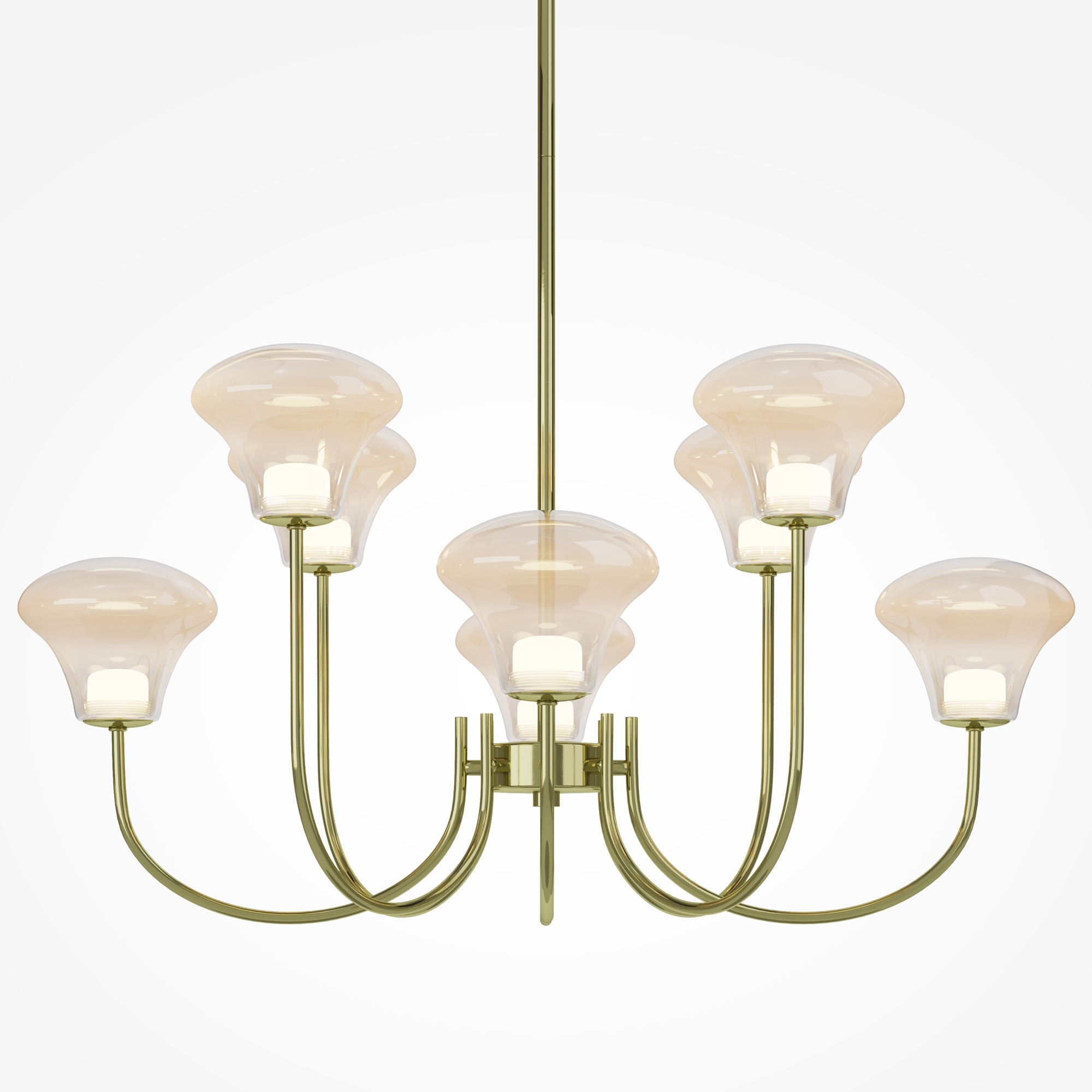 Серия Dynasty вдохновлена атмосферой бальных залов и представлена подвесными светильниками (люстры) на 6 и 8 плафонов, настенным светильником (бра). Обтекаемая форма плафона с градиентом от янтарного к прозрачному. Арочный дизайн металлической арматуры в цвете сатинированной латуни. Блеск металла и глянец стекла дополнены светом LED-источника (3000K). Высота люстр регулируется разборной штангой. Светильники Dynasty станут ярким акцентом в гостиной, столовой, спальне, рабочем кабинете или прихожей.