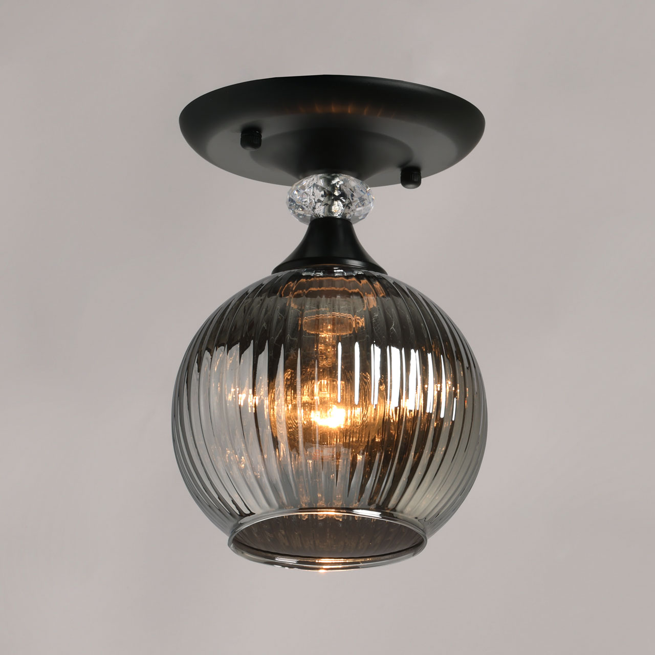 Металлическое основание светильника окрашено в черный цвет. Стеклянный плафон отлит в сложную форму и гальванизирован в дымчатый цвет. У основания светильник декорирован прозрачным хрусталем.