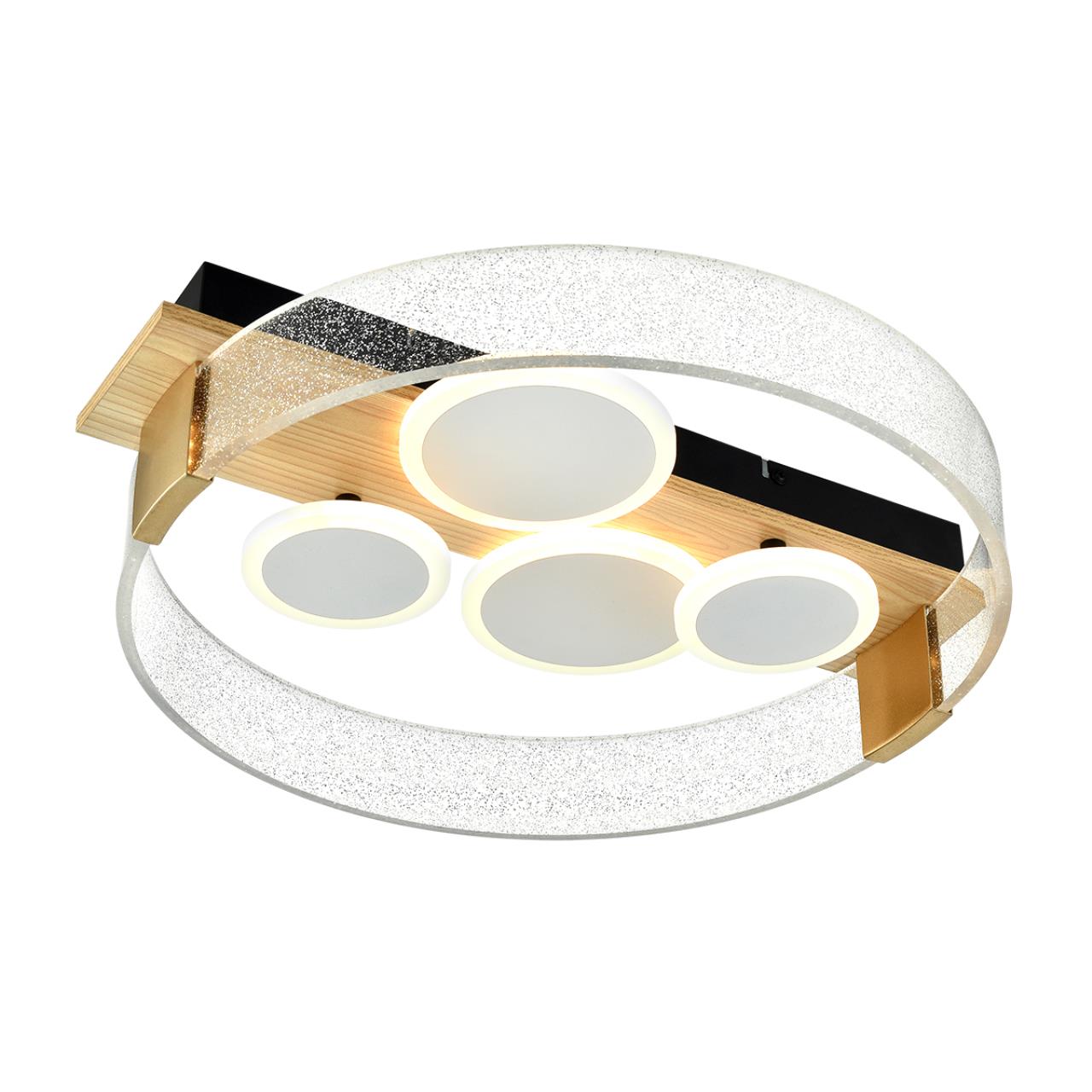 В светильнике SPOTS смешалось все - стили, цвета, фактуры. Черное металлическое потолочное основание сочетается с декоративным основанием из МДФ цвета натурального дерева. Оно, в свою очередь, сочетается с прозрачным акриловым рассеивателем с мириадами глиттера и белыми окружностями со светодиодными контурами. Вся композиция собирается и удерживается золотыми креплениями-скобами. Эко, модерн, минимализм, арт-деко - это все SPOTS. SPOTS - яркий представитель стиля фьюжн! Светильник оснащен пультом ДУ.