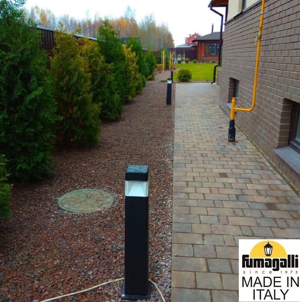 Садовый светильник-столбик FUMAGALLI серии ELISA, модель ELISA 800 - изготовлены в Италии. Используются для освещения парковых дорожек, тротуарных настилов, газонов, веранд, беседок, подпорных стенок, декоративного и дизайнерского освещения. Подойдут и для других внутренних и уличных интерьеров, где требуется ровное, дизайнерское освещение. Отражатель светильника белого цвета, раскидывает световой поток широкими лучами на четыре стороны. Это позволяет получить и высокую степень освещенности от светодиодной лампы . Высокая степень защиты от пыли и влаги IP 55 позволяет использовать садовые столбики ELISA 800 на улице без ограничений. Светильник устанавливается на землю (фундамент) или другую горизонтальную поверхность Корпус не проводит электричество! Для подсветки строений рекомендуем обратить внимание на консольный светильник ELISA WALL, который крепится на стену или другую вертикальную поверхность (забор, колонну). Если вам понадобится светильник из этой же коллекции для ландшафтной подсветки деревьев, кустарников, альпийских горок - можно использовать ELISA SPIKE на колышке. Для освещения парковых дорожек, колон заборов, ландшафтного дизайна возможно комбинировать ландшафтные светильники серии ELISA в любой последовательности. Корпус изготовлен из современного вандалостойкого не горючего полимера RESIN. Прочного, окрашенного в массе, не ржавеющего и не выгорающего на солнце, не проводящего электричество. Рассеиватель выполнен из антивандального, не мутнеющего и не горючего PMMA. Срок службы светильника - не менее 20 лет. Не требуется трансформатор. Напряжение питания - 220 В. Температура эксплуатации от -60 до +90. При заказе требуется выбрать цвет корпуса.