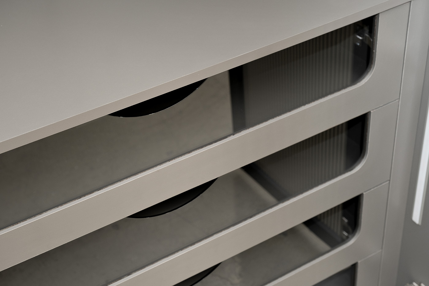 Изысканный двухдверный шкаф с выдвижными ящиками, декорированный рельефным тонированным стеклом, станет украшением гостиной или столовой, оформленной в стиле ар-деко. Игра света на рельефной поверхности стекла создает необычный оптический эффект и придает этому предмету мебели особый шарм. Темный оттенок тонированного стекла приглушает блеск и создает ощущение таинственности. В шкафу предусмотрены выдвижные ящики для белья и штанга для одежды. Складская программа. Шкаф двухдверный c выдвижными ящиками, дверца- стекло рифленое (ЛДСП серый Кобальт 6299BS, тм Kronospan)