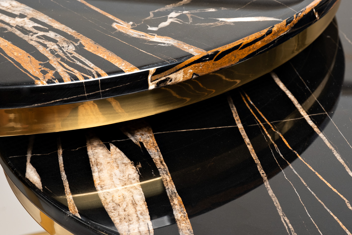 Комплект журнальных столов для гостиной – удачный выбор для гостиной, кабинета или спальной. Эти круглые журнальные столы немного различаются размерами. В результате один из них удобно задвигается под другой, экономя пространство. При необходимости столики можно раздвинуть, если у вас намечаются гости. Такой набор журнальных столов выглядит необычайно стильно и презентабельно. Мебель выполнена со вкусом, отвечает современным требованиям качества. Оригинальная опора из полированной нержавеющей стали золотого цвета эффектно сочетается со столешницей из черного искусственного мрамора с цветными прожилками. Размеры столов - 100х100х41, 80х80х34 см. Комплект столов в таком же дизайне, но в меньшем размере - арт. 57EL-ET101В-BL