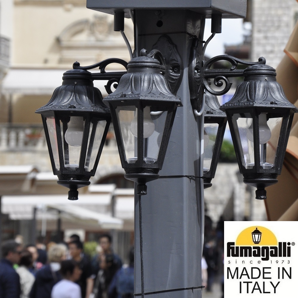 Светильники уличные настенные FUMAGALLI серии ANNA, модель ANNA/BISSO DN. Консольный уличный светильник для монтажа на стену. Настенный кронштейн BISSO малого размера и светильник ANNA установленный "вниз". Используются для фасадного и архитектурного освещения в стиле "классика". Место установки уличных светильников - фасады, колонны и другие вертикальные поверхности исторических зданий, котеджей, загородных домов, церквей, а так же, другие места где требуется и возможна установка фонарей. Изготовлены в Италии, по уникальным технологиям "FUMAGALLI" из современного композитного полимера RESIN. Этот материал в 5 раз прочнее металла, не ржавеет, не окисляется, не выгорает на солнце, его не нужно красить. Все светильники пыле-влаго защищены по стандарту IP55 (защита от пыли, защита от струй воды, падающих под любым углом). Рассеиватель выполнен из антивандального, не мутнеющего и не горючего PMMA (ПолиМетилМетаАкрилат). Срок службы светильника - не менее 20 лет. Температура использования от -60 до +90. В серии ANNA есть фонари в настенном (BISSO/ANNA, PORPORA/ANNA) подвесном (SICHEM/ANNA, SICHEM/ANNA 3L) и наземном исполнении (IAFAET.R/ANNA, ALOE.R/ANNA, ARTU/ANNA, GIGI/ANNA, RICU/ANNA, RICU/ISSO/ANNA 1L, RICU/ISSO/ANNA 2L, RICU/ISSO/ANNA 3L) со столбами разной высоты, с разным количеством и конфигурацией голов. Консоли настенных фонарей и кронштейны светильников на столбах освщения могут устанавливаться вверх/вниз. Столбы выше 150 см имеют в основе мощную стальную трубу с двойной оцинковкой. При заказе требуется выбрать цвет корпуса, цвет плафона и тип патрона. Возможен светодиодный вариант с LED цоколем GX-53. По стилю и дизайну серия уличных светильников ANNA похожа на светильники среднего размера серии RUT и на светильники большого размера серии NOEMI. По размеру ANNA относится к малым светильникам как серия SABA и GLOBE 250.