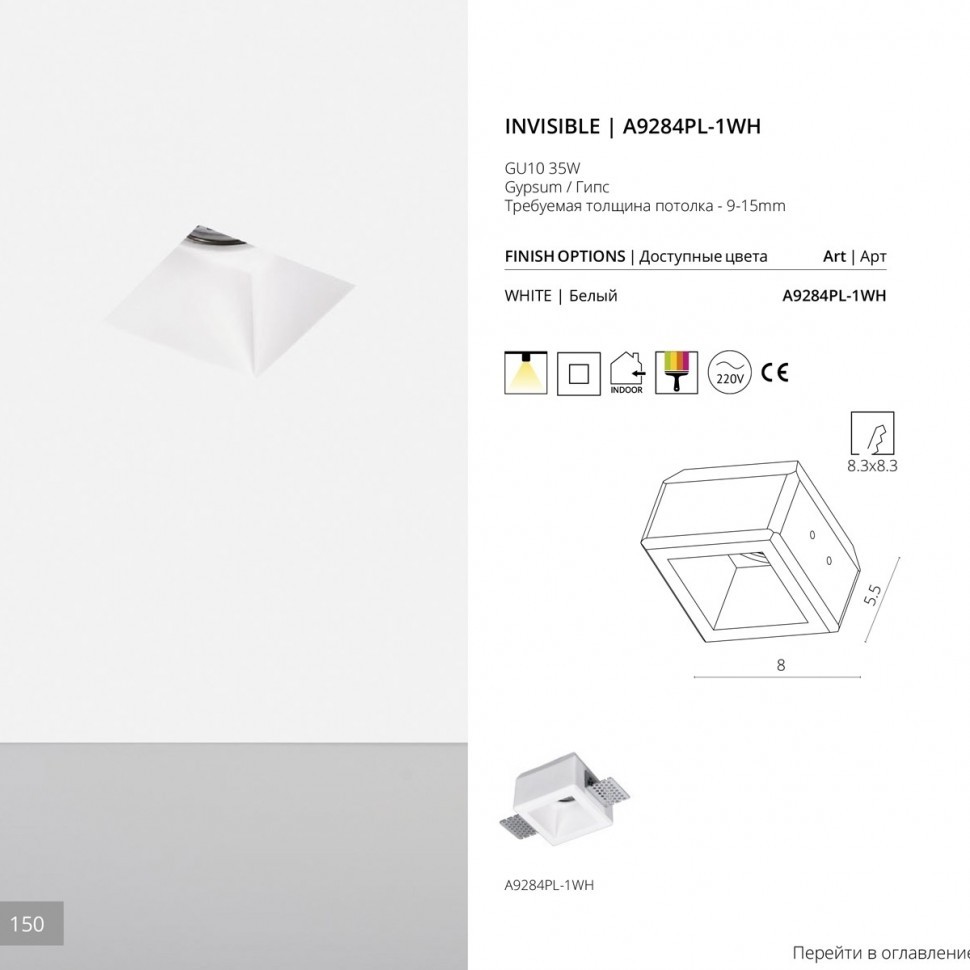 Встраиваемый светильник Arte Lamp A9284PL-1WH, входящий в серию Invisible, отлично подойдет для освещения пространства на кухне, на даче, в гардеробной, в прихожей, в кабинете, в баре, оформленных в современном стиле или в стиле Техно. Данный спот имеет один гипсовый плафон белого цвета, выполненный в форме призмы и направленный вниз, а также белую арматуру, изготовленную из алюминия. Итальянский производитель Arte Lamp дает гарантию на свое изделие 1 год и рекомендует использовать для устройства полусферические лампы с рефлектором цоколя GU10 и мощностью 35 Вт, что позволяет осветить помещение площадью 2 кв. м., при этом общий световой поток зависит от купленных ламп. Технической особенностью этого осветительного прибора является возможность диммирования освещения, при условии покупки диммируемых ламп. Анкерный способ крепления встраиваемого светильника к потолку позволяет быстро и просто осуществить монтаж спота, при этом диаметр врезного отверстия равен 83 мм х 83 мм, а высота встраиваемой части составляет 55 мм . Лаконичный дизайн, матовая белая поверхность и нейтральная цветовая температура встраиваемого светильника Arte Lamp A9284PL-1WH, делают его особенным элементом декора, который украсит любое интерьерное пространство.