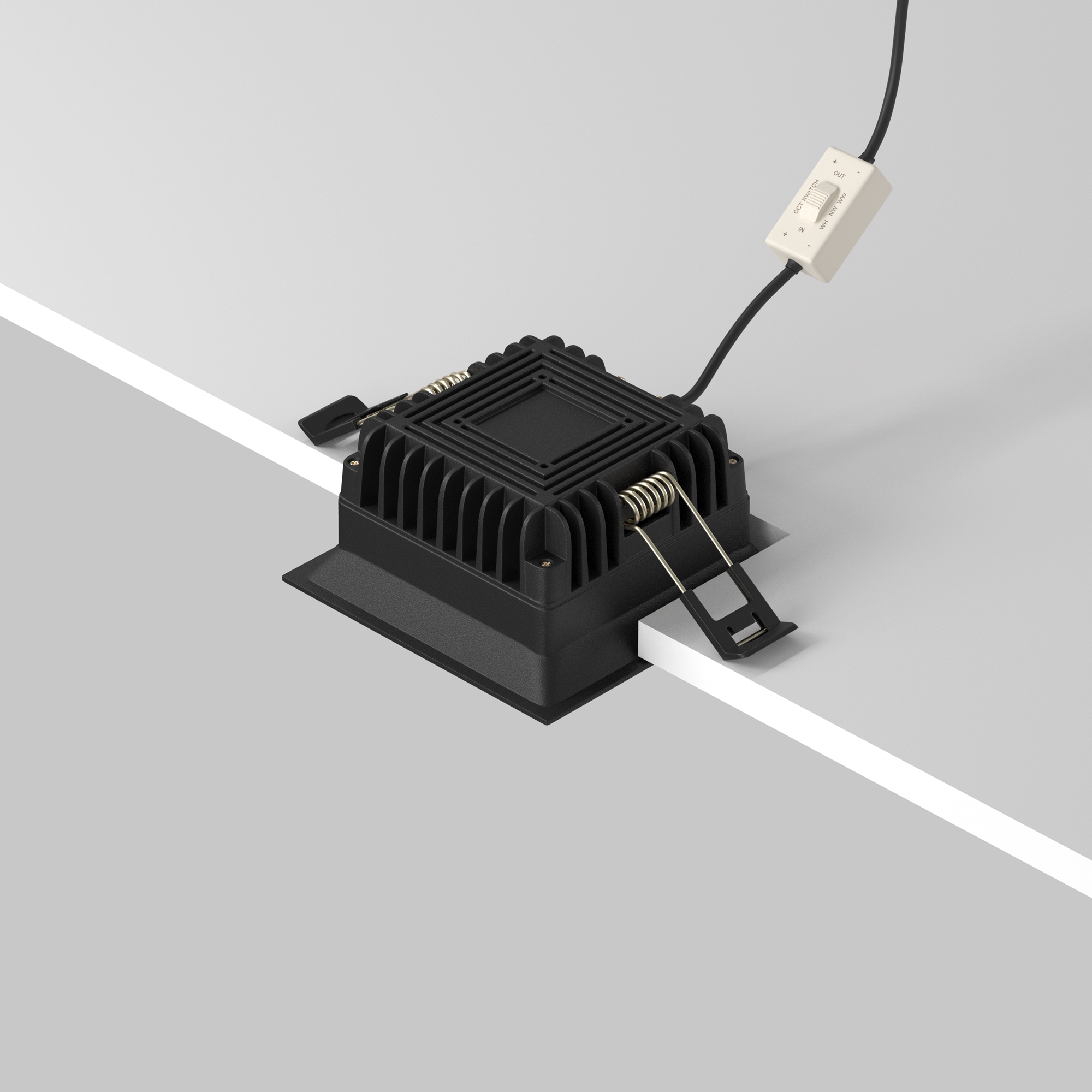 Материал арматуры - алюминий и пластик. Организация основного освещения в интерьере. Высокий коэффициент цветопередачи >90. Качественное отображение цветов. Утопленный матовый рассеиватель. Переключатель цветовой температуры. Повышенная степень пылевлагозащиты IP 44.